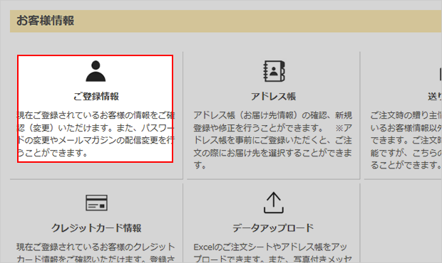 メールマガジンの解除方法STEP1マイページ内のお客様情報にある「ご登録情報」をクリックします。