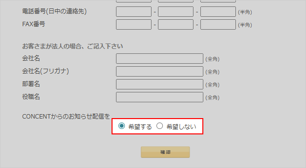 STEP2「お客様ご登録情報の変更」の最後に【CONCENTからのお知らせ配信】の受取希望についての項目があります。メールマガジンの配信を希望する場合は「希望する」を選択して確認ボタンをクリックしてください。