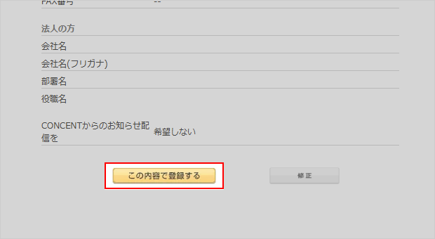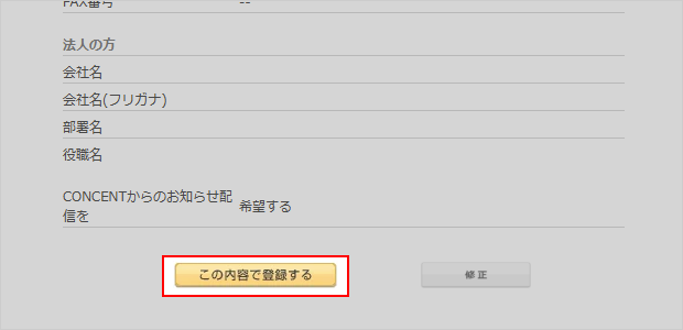 STEP3変更内容をご確認いただき、問題ないようでしたら「この内容で登録する」ボタンをクリックしてください。修正する場合は「修正」ボタンをクリックすると前のページに戻ります。