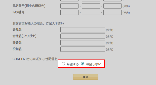 STEP2「お客様ご登録情報の変更」の最後に【CONCENTからのお知らせ配信】の受取希望についての項目があります。メールマガジンの配信を希望しない場合は「希望しない」を選択して確認ボタンをクリックしてください。