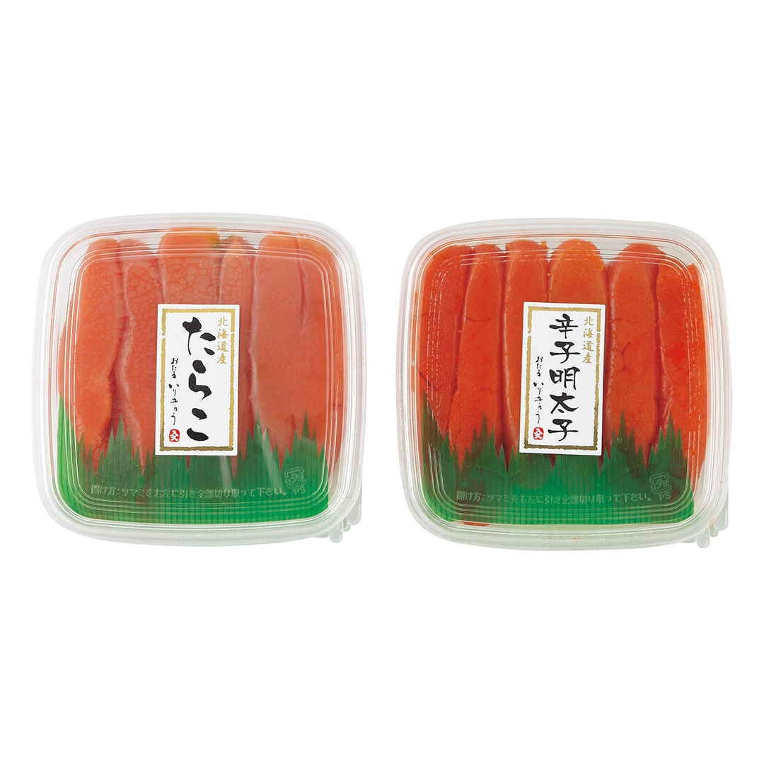 北海道で水揚げされたスケトウダラの卵を使用した粒立ちの良い甘口たらこと、調味液に漬け込んだ辛子明太子を詰め合わせました。