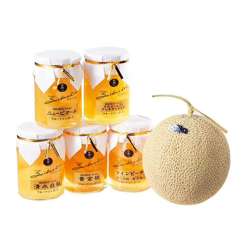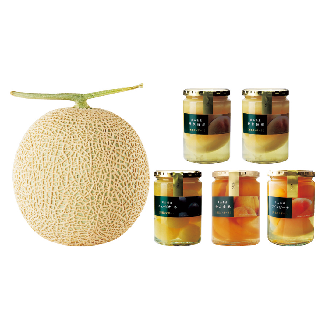 | 内容量 | クラウンメロン 1玉(1.2kg)、フルーツコンポート(清水白桃×2、ニューピオーネ・中山金桃・ツインピーチ) 各360g |