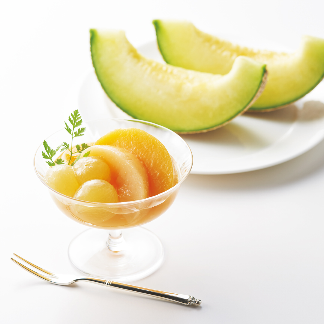 豊潤な甘さと気品ある香りが際立つクラウンメロンと、フルーツの美味しさをそのまま封じ込めたシロップ漬です。