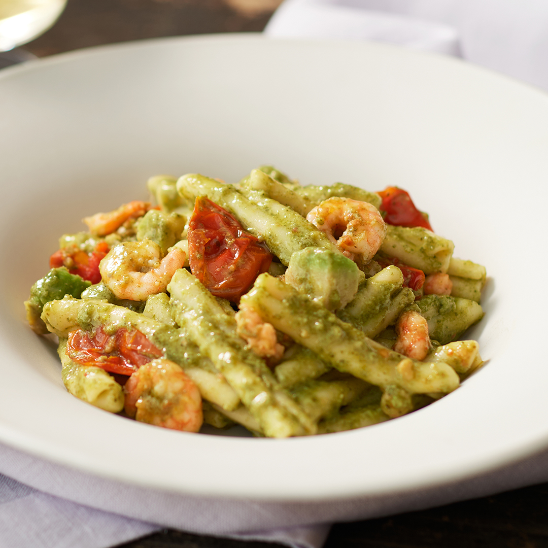 めん(マカロニ(イタリア製造)、食塩)、海老(タイ)、チキンブイヨン、アボカドダイス、セミドライトマト、ほうれん草、植物油脂、バジルソース、洋酒、アボカドペースト、ローストアーモンド、チーズ、魚醤、香味調味料、食塩、にんにくペースト、レモン果汁/増粘剤(加工デンプン)、調味料(アミノ酸等)、香辛料抽出物、酸味料、酸化防止剤(V.C)、(一部に乳成分・小麦・えび・かに・大豆・牛肉・豚肉・鶏肉・ゼラチン・アーモンド・魚醤(魚介類)を含む)