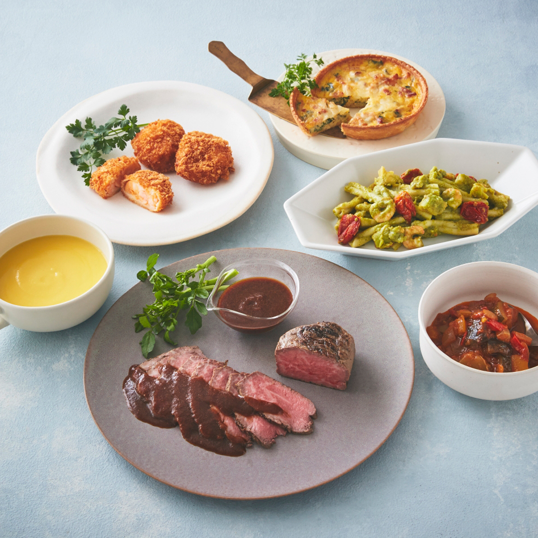 メイン料理は、やわらかな最高等級のプライムビーフのグリル。一緒に食卓に並べて楽しめる色とりどりのデリもおススメ。海老の香り、美味しさをストレートに味わう、プチサイズの海老カツレツ、さっくりしたパイ生地に自社製ベーコンの旨みたっぷりのキッシュや、バジル香るショートパスタ、7種の野菜のうまみを凝縮したラタトゥイユ。