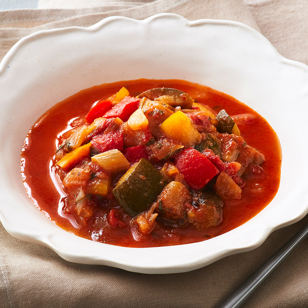 茄子(国産)、玉葱(国産)、トマト加工品、ズッキーニ、ブイヨン(玉葱、人参、セロリ)、赤パプリカ、黄パプリカ、植物油脂、セロリ、にんにく、トマトペースト、食塩、バジル、香味調味料、香辛料、タイム/増粘剤(加工デンプン)、調味料(アミノ酸等)、香辛料抽出物、酸味料、(一部に小麦・大豆・鶏肉を含む)■じゃがいもグラタン