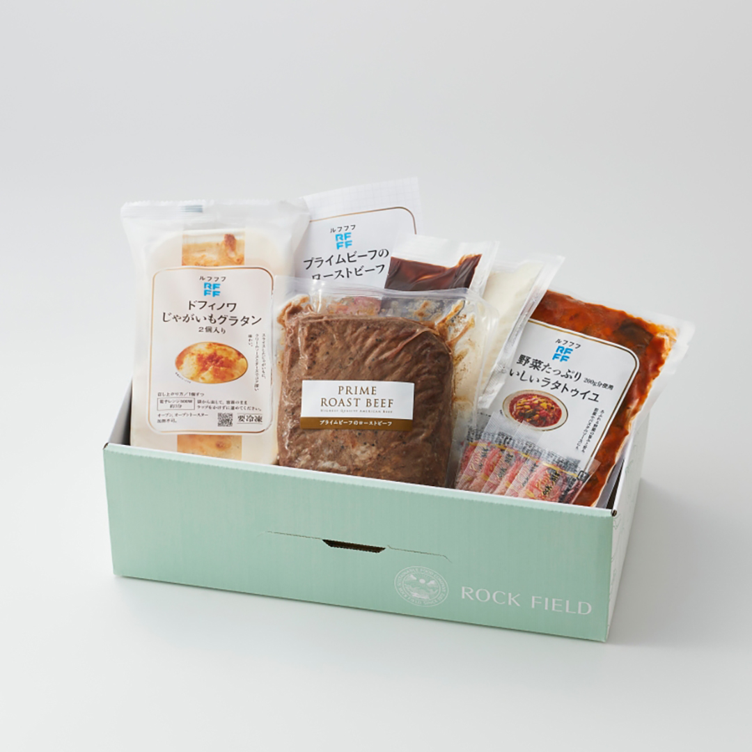 セット内容 | プライムビーフのローストビーフ×1P / 野菜たっぷり200g分使用 おいしいラタトゥイユ×1P / ドフィノワ じゃがいもグラタン 2個入り×1P |