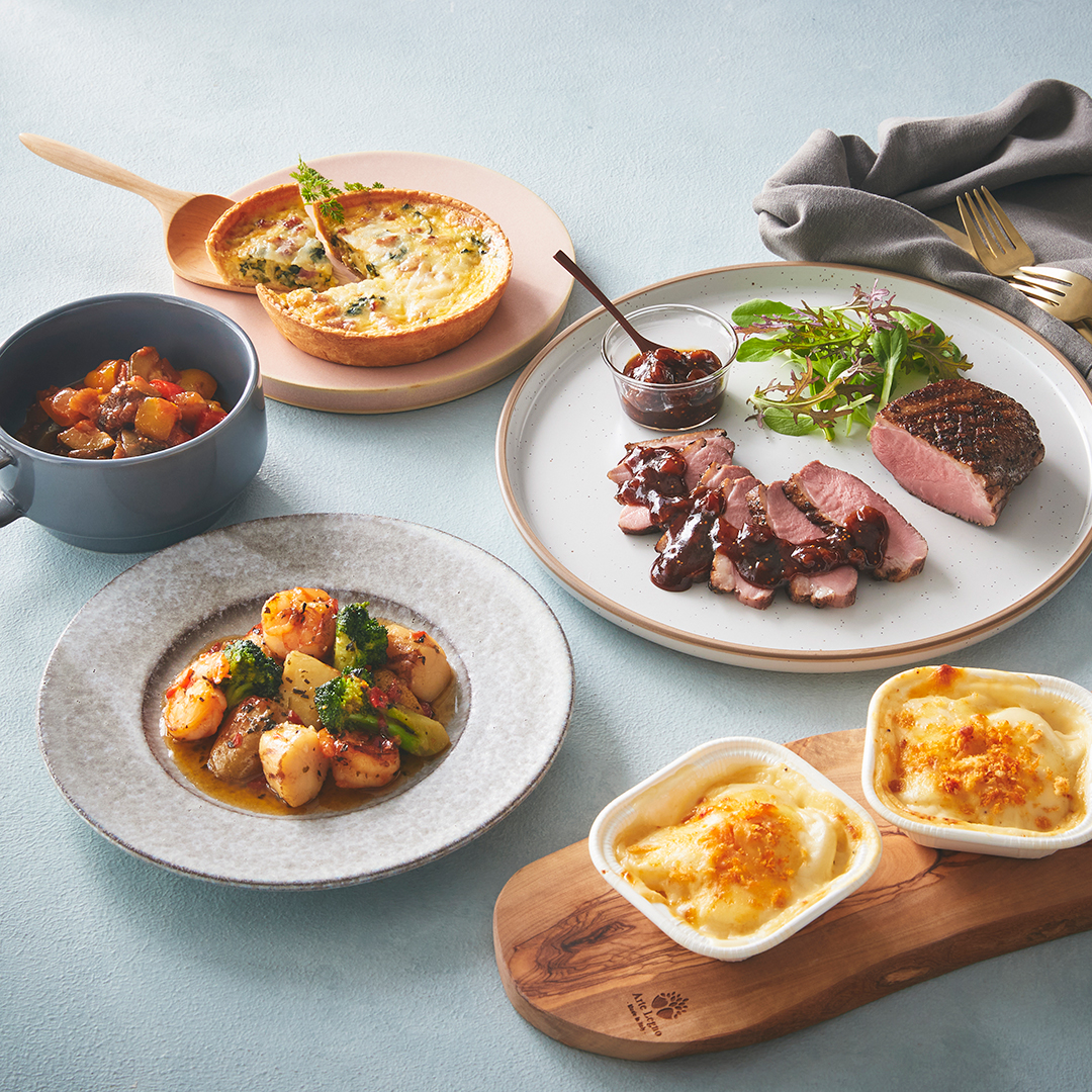 前菜にぴったりなキッシュ、魚介料理、合鴨のロースト、濃厚なチーズと焼き上げたドフィノワなど、お酒とマッチする5種類の冷凍料理の組み合わせ。