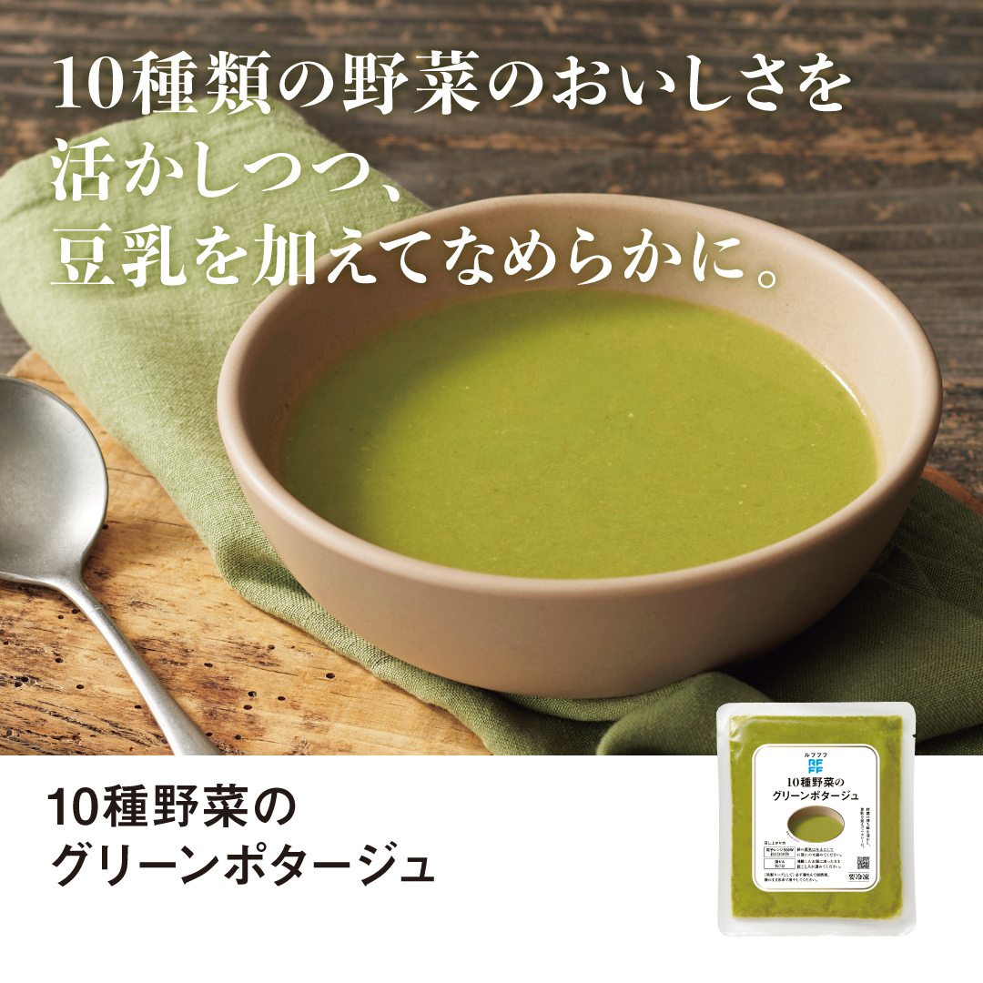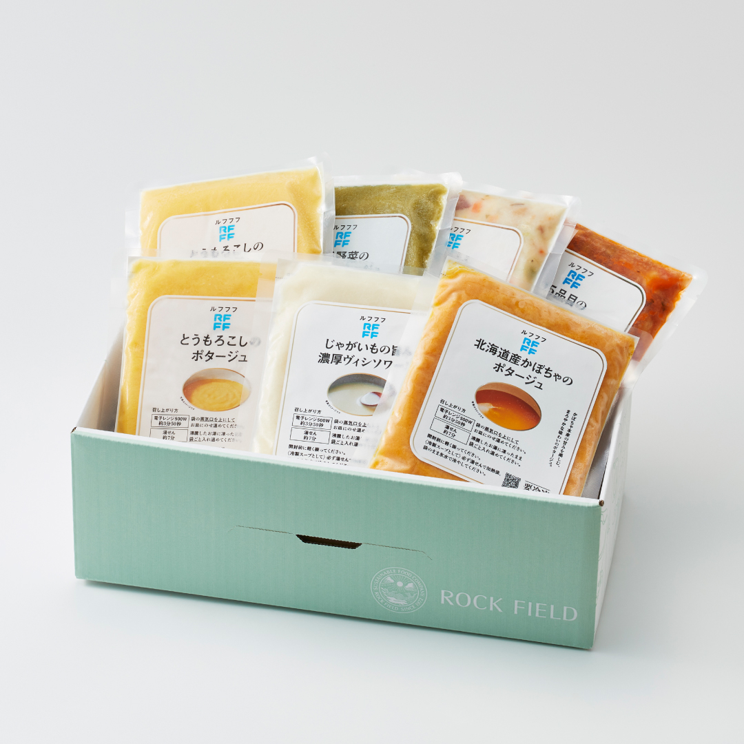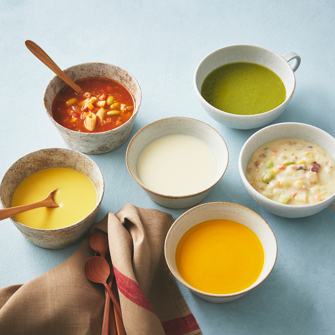 セット内容 | 10種野菜のグリーンポタージュ×1P / とうもろこしのポタージュ×2P / 具だくさんクリームチャウダー×1P / 15品目のミネストローネ×1P / じゃがいもの旨み 濃厚ヴィシソワーズ×1P / 北海道産かぼちゃのポタージュ×1P |