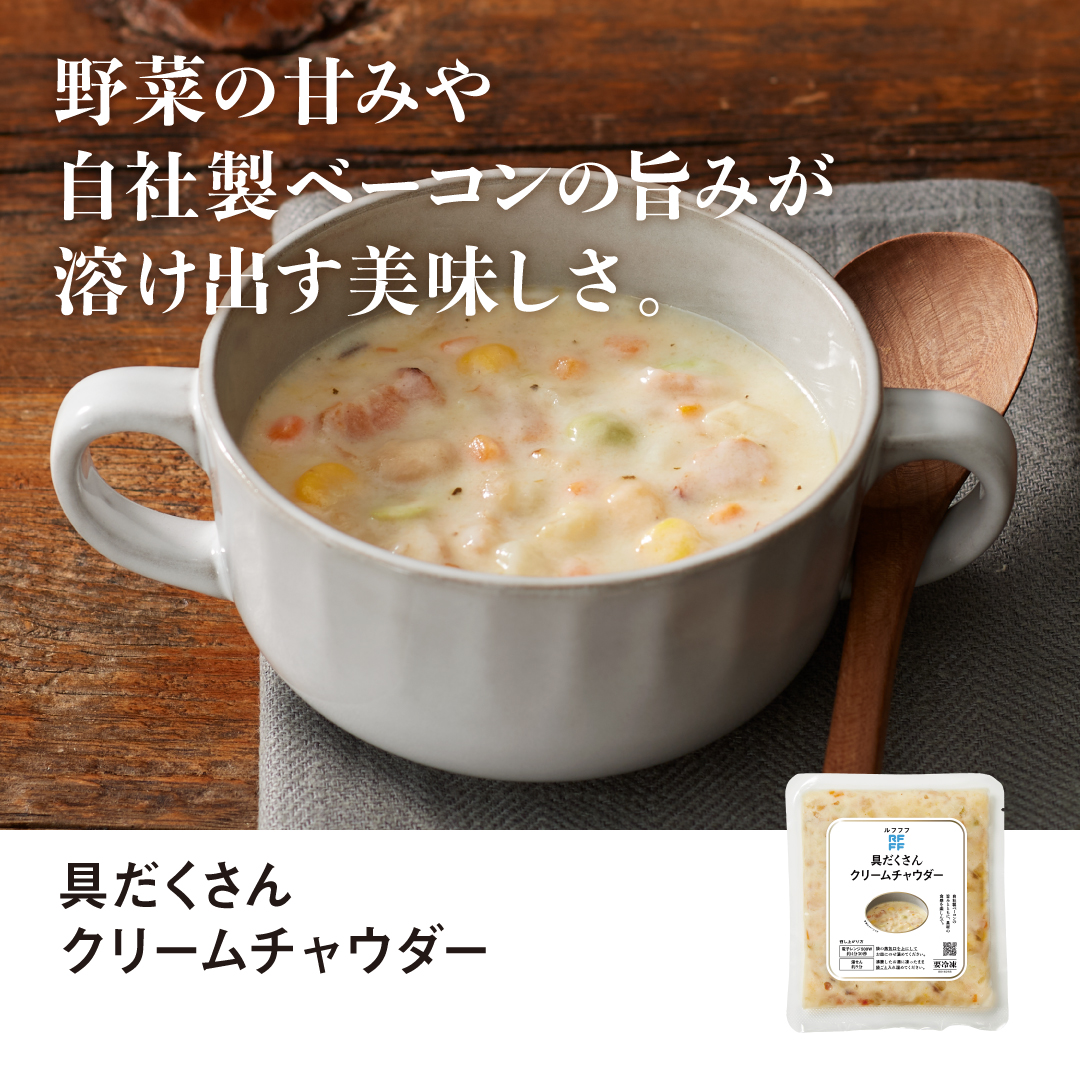 とうもろこし(北海道)、牛乳、バター、チキンブイヨン、クリーム、植物油脂、食塩、砂糖、香味調味料/増粘剤(加工デンプン)、調味料(アミノ酸等)、酸味料、香辛料抽出物、(一部に乳成分・小麦・大豆・鶏肉を含む)■クリームチャウダー