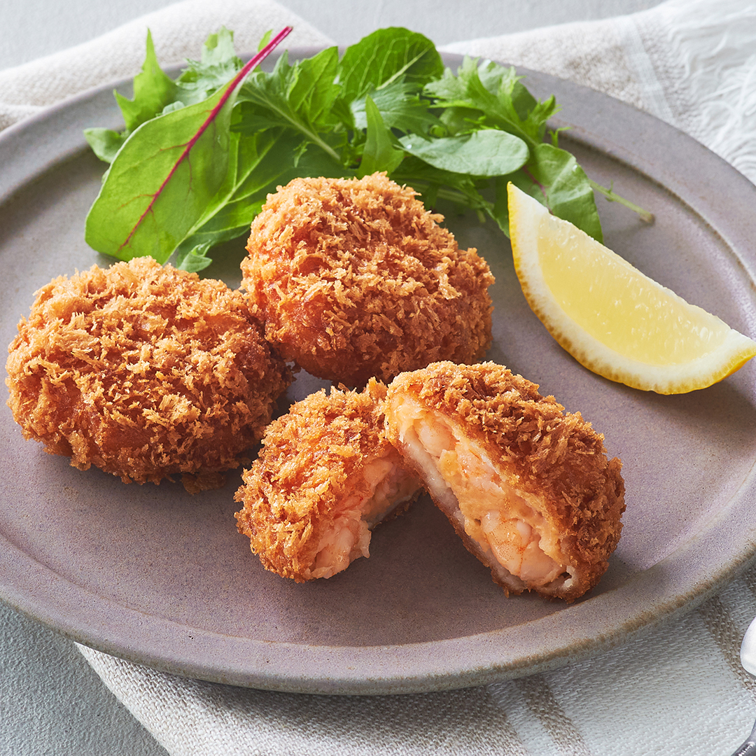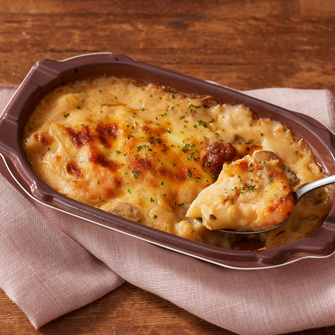 海老(ミャンマー)、魚介すり身、豚脂、加糖卵黄、干し海老、砂糖、食塩、香味食用油、香味調味料、オキアミペースト、植物油脂、香辛料、でん粉、醸造酢、衣(パン粉、バッター粉(小麦粉、クラッカー、でん粉、植物性油脂、砂糖))、揚げ油(なたね油)/加工デンプン、調味料(アミノ酸等)、pH調整剤、トレハロース、香辛料抽出物、酸味料、増粘剤(加工デンプン、増粘多糖類)、(一部に卵・乳成分・小麦・えび・大豆・いか・豚肉・鶏肉を含む)■海老グラタン