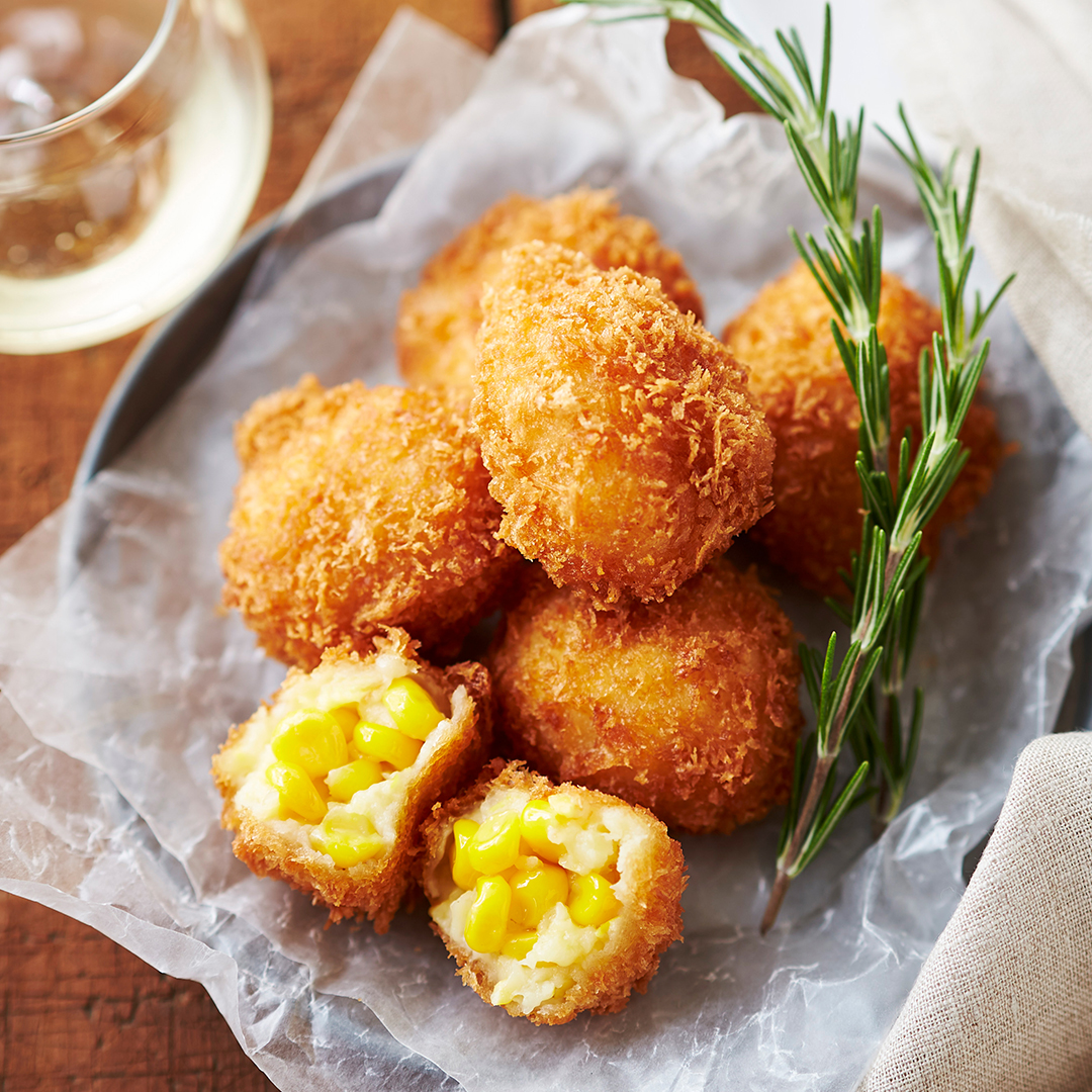 パイ生地(小麦粉、マーガリン、バター、鶏卵、砂糖、食塩)(国内製造)、玉葱(国産)、牛乳、液全卵、チーズ(サムソー、グリュイェール、パルミジャーノ・レッジャーノ)、ベーコン、ほうれん草(国産)、植物油脂、クリーム、液卵黄、ホワイトルウ、バター、砂糖、食塩、香味調味料、香辛料/増粘剤(加工デンプン)、リン酸塩(Na)、酸化防止剤(V.C)、調味料(アミノ酸等)、発色剤(亜硝酸Na)、香辛料抽出物、香料、酸味料、着色料(カロチン)、(一部に卵・乳成分・小麦・大豆・豚肉・鶏肉を含む)■とうもろこしのプチクリームコロッケ