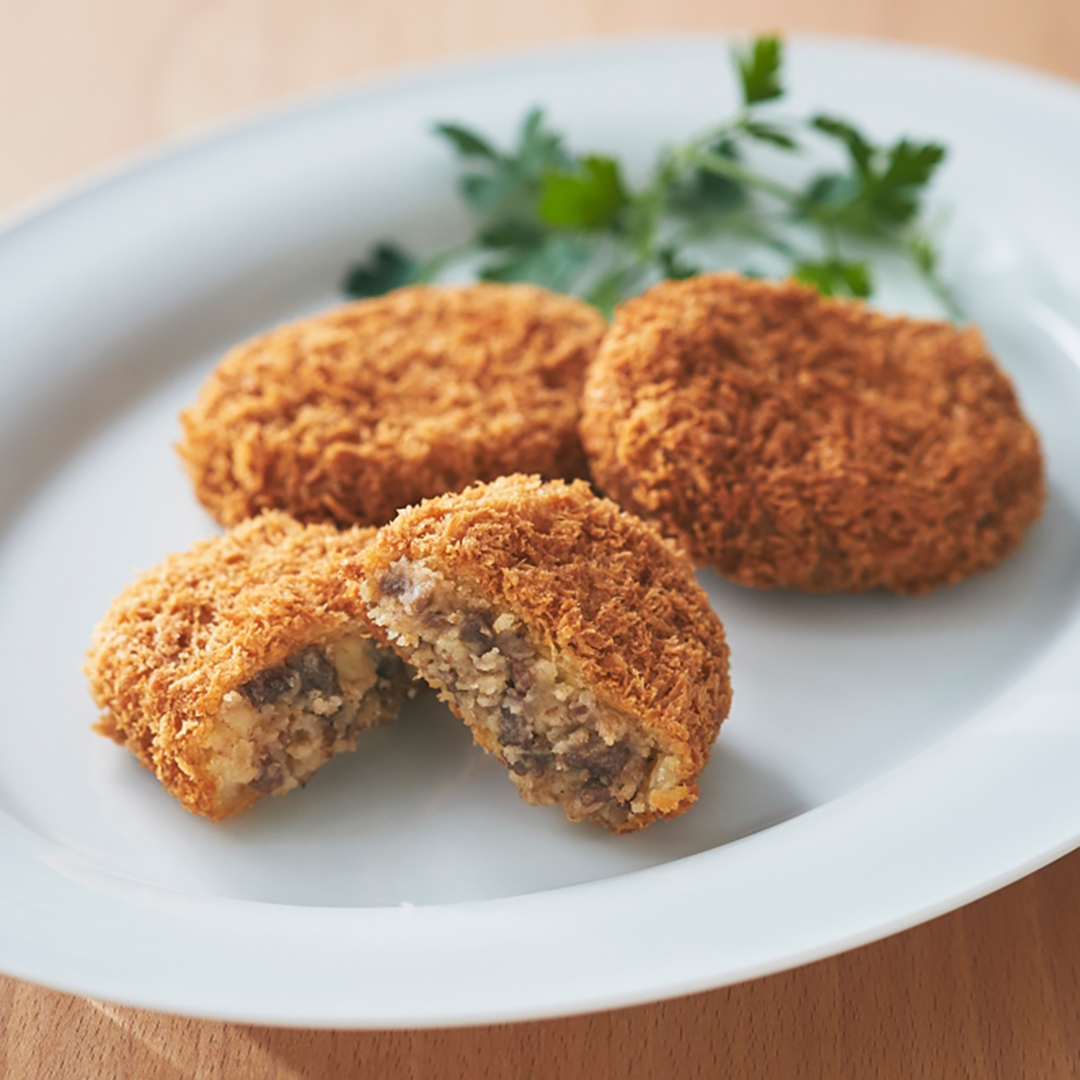 じゃがいも(国産)、牛肉(国産)、牛脂(国産)、オニオンソテー、ブイヨン(鶏ガラ、鶏肉、玉葱、人参、セロリ、にんにく、香辛料)、砂糖、醤油、香味調味料、食塩、生姜ペースト、にんにくペースト、香辛料、衣(パン粉、バッター粉(小麦粉、植物油脂、糖類(砂糖、コーンシロップ)、でん粉、米粉))、揚げ油(なたね油)/調味料(アミノ酸等)、ベーキングパウダー、加工デンプン、増粘多糖類、着色料(V.B2、カロチノイド、カラメル)、香辛料抽出物、酸味料、(一部に乳成分・小麦・大豆・牛肉・鶏肉を含む)