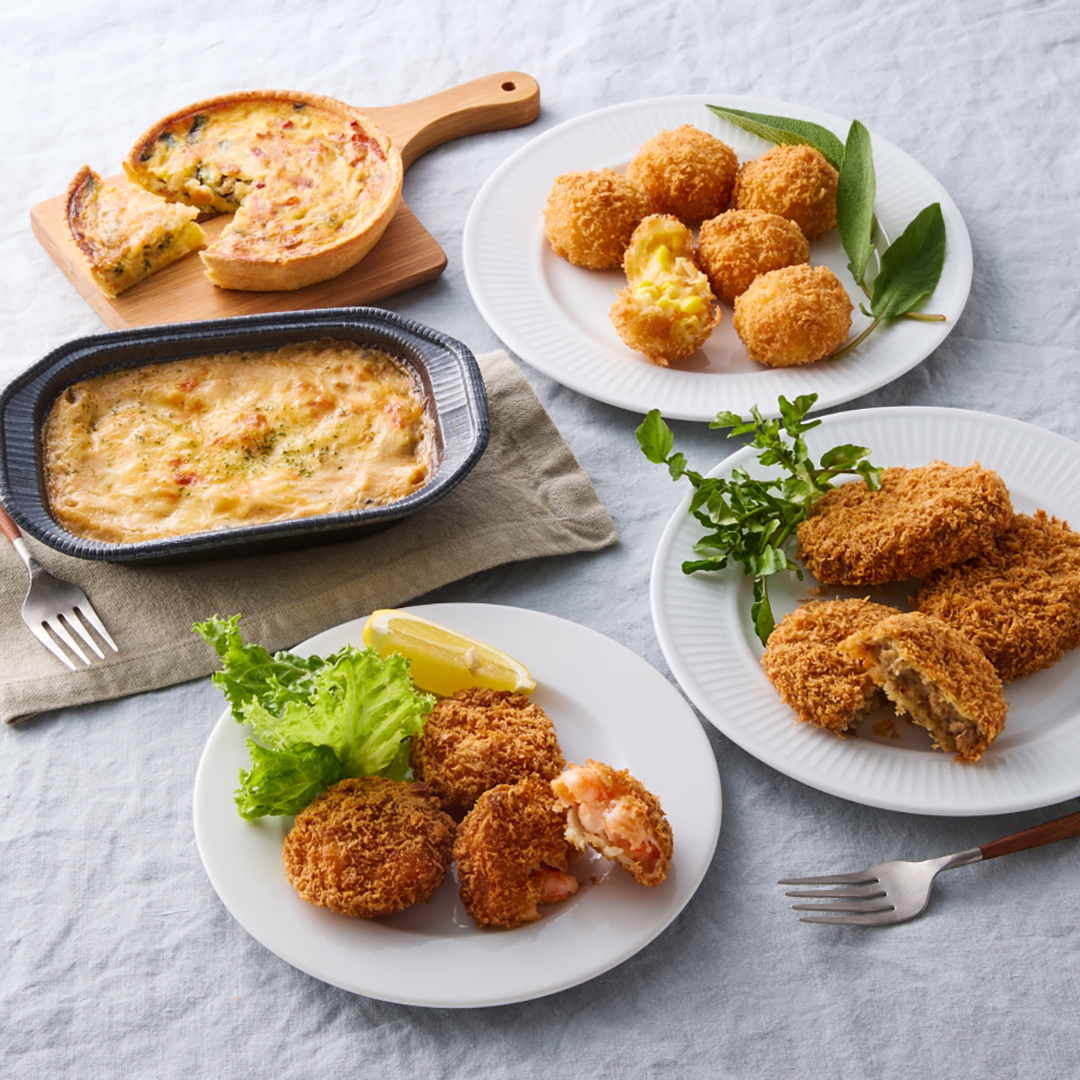 セット内容 | ぷりぷりプチ海老カツ 3個入り×1P / まろやか海老グラタン×1P / ベーコンとほうれん草のフロマージュキッシュ×1P / 北海道産とうもろこしのプチクリームコロッケ 6個入り×1P / 旨みに感動 ビーフコロッケ 3個入り×1P |
