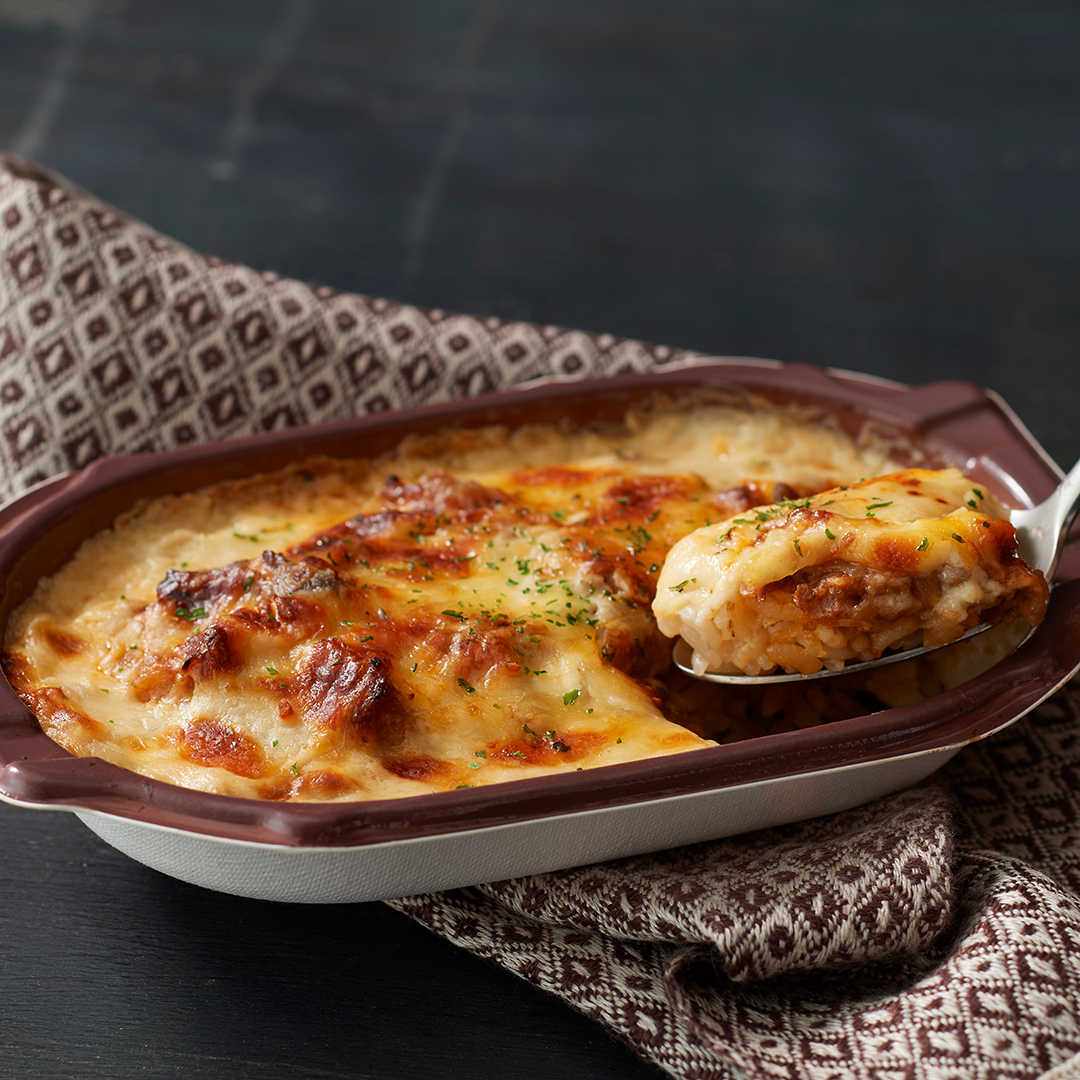 野菜(玉葱(国産)、人参、にんにく)、牛乳(国内製造)、うるち米(国産)、牛肉(国産)、洋酒、マッシュルーム、チーズ、デミグラスソース、押し麦、トマトソース、植物油脂、トマトケチャップ、ホワイトルウ、牛脂、バター、チキンブイヨン、クリーム、食塩、香味調味料、ビーフ・野菜ブイヨン粉末、香辛料/増粘剤(加工デンプン、グァーガム)、加工デンプン、キシロース、調味料(アミノ酸等)、酸味料、着色料(カラメル)、香料、香辛料抽出物、(一部に乳成分・小麦・大豆・牛肉・鶏肉・ゼラチンを含む)■ハンバーグ デミグラスソース