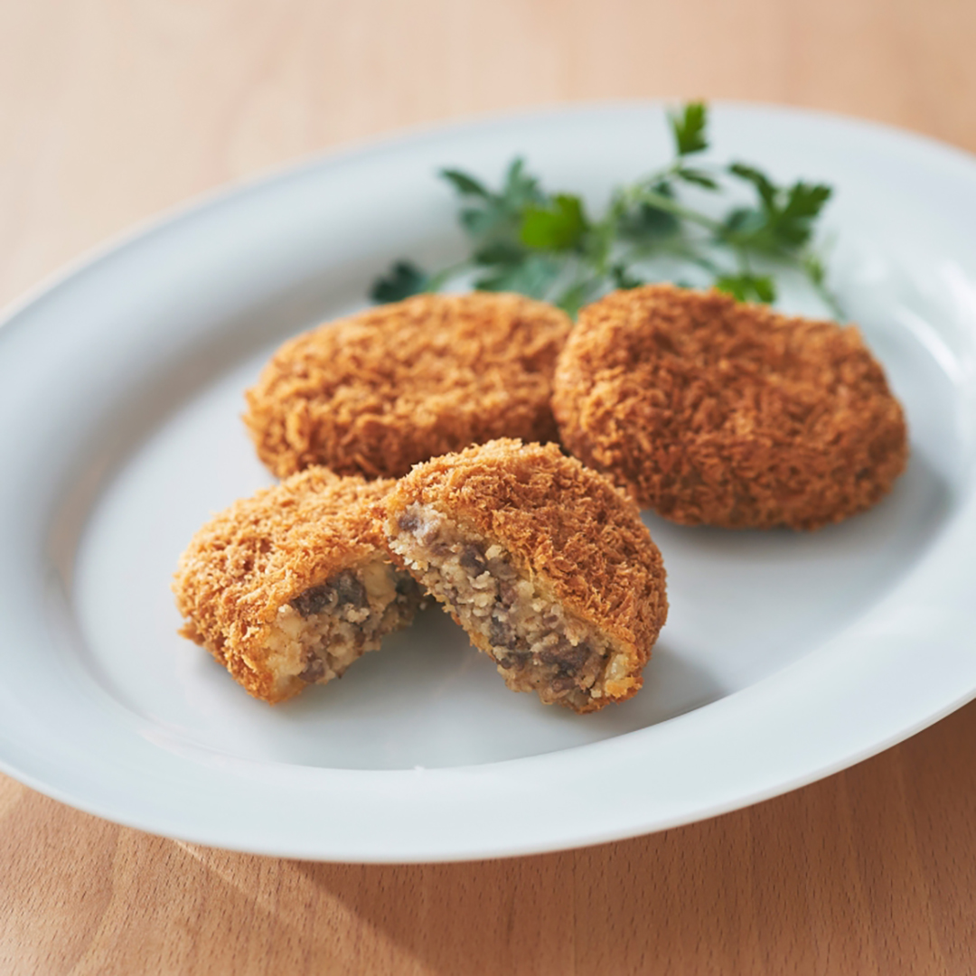 じゃがいも(国産)、牛肉(国産)、牛脂(国産)、オニオンソテー、ブイヨン(鶏ガラ、鶏肉、玉葱、人参、セロリ、にんにく、香辛料)、砂糖、醤油、香味調味料、食塩、生姜ペースト、にんにくペースト、香辛料、衣(パン粉、バッター粉(小麦粉、植物油脂、糖類(砂糖、コーンシロップ)、でん粉、米粉))、揚げ油(なたね油)/調味料(アミノ酸等)、ベーキングパウダー、加工デンプン、増粘多糖類、着色料(V.B2、カロチノイド、カラメル)、香辛料抽出物、酸味料、(一部に乳成分・小麦・大豆・牛肉・鶏肉を含む)