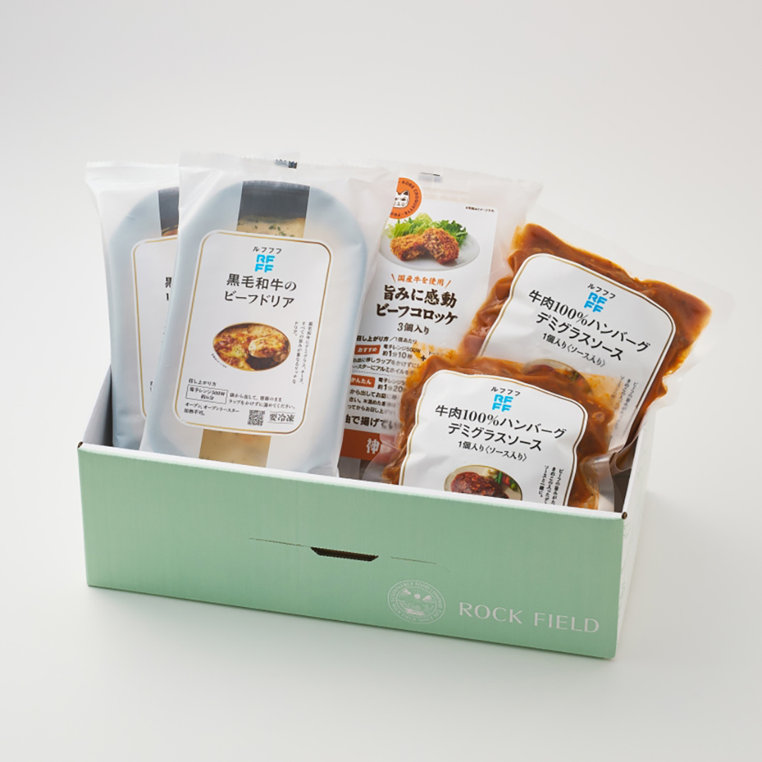 セット内容 | 黒毛和牛のビーフドリア×2P / 牛肉100%ハンバーグ デミグラスソース×2P / 旨みに感動 ビーフコロッケ 3個入り×1P |