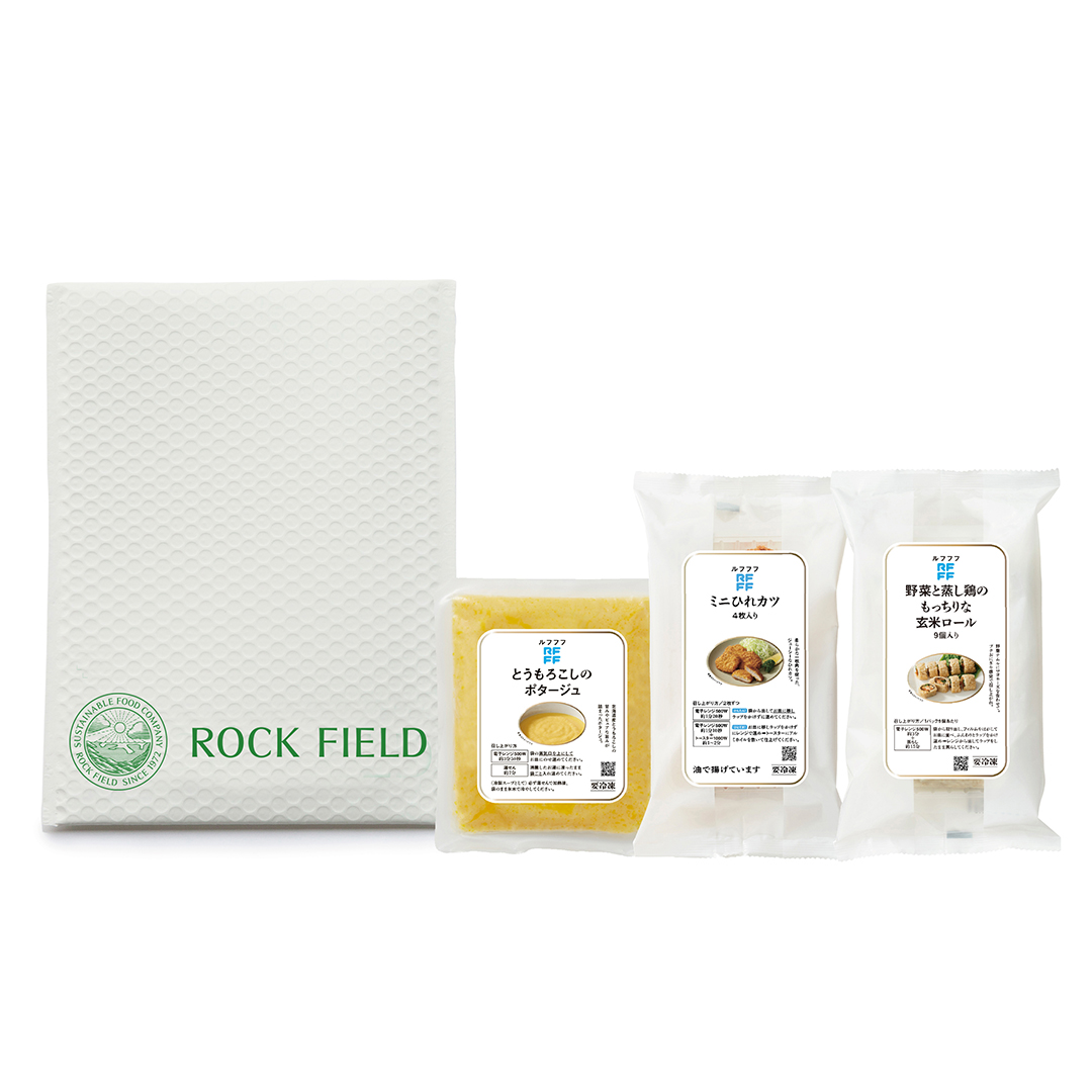 セット内容 | ミニひれカツ 4枚入り×1P / 野菜と蒸し鶏のもっちりな玄米ロール 9個入り×1P / とうもろこしのポタージュ×1P / |