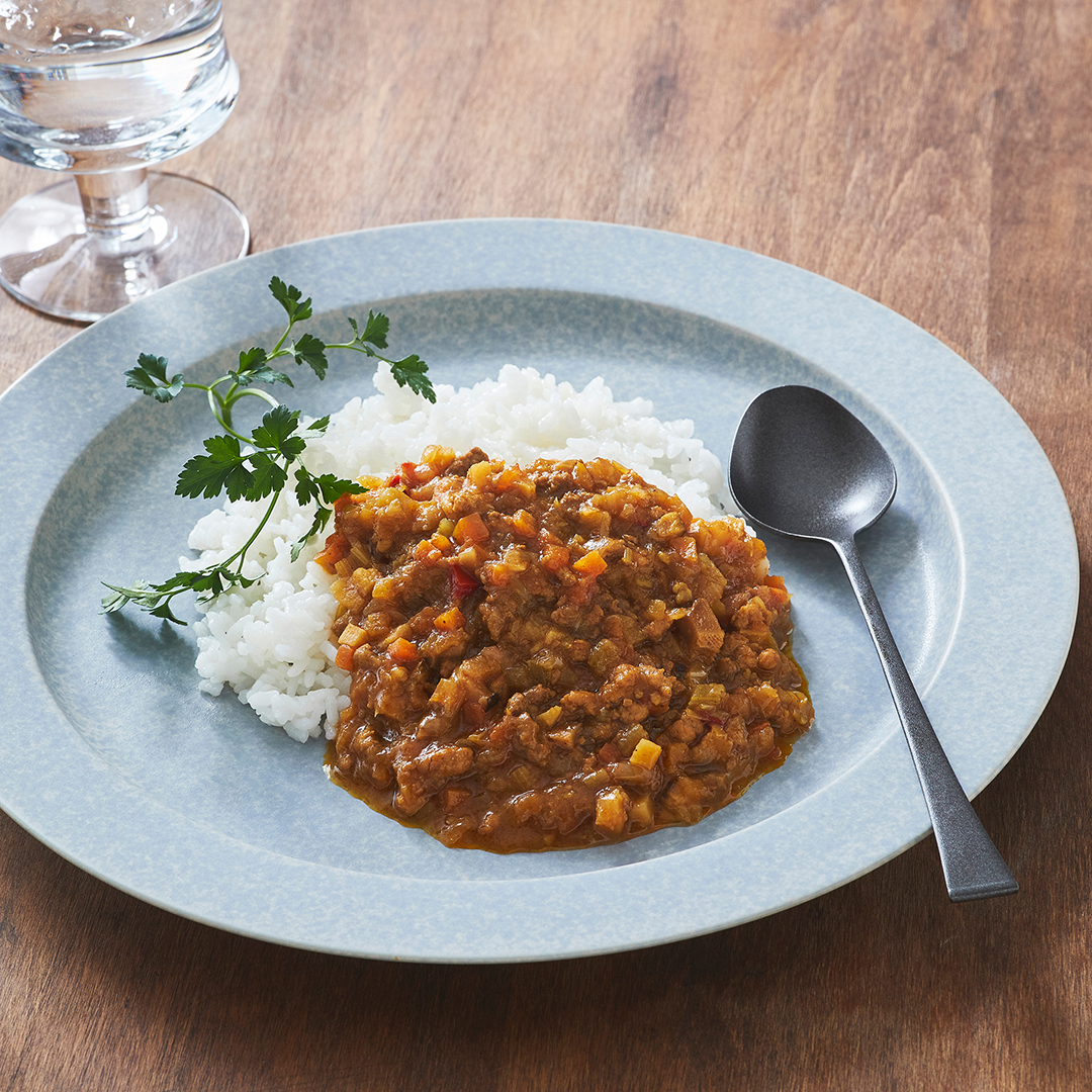 7種の野菜が入った、からだ想いのキーマカレーとミニサイズのヒレカツ4個入りのセット。