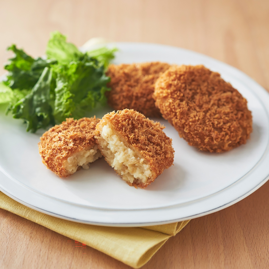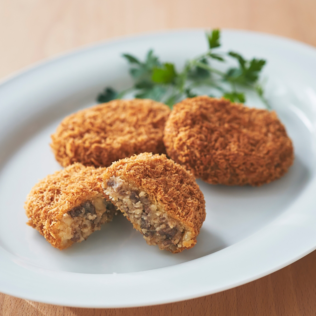 じゃがいも(国産)、牛肉(国産)、牛脂(国産)、オニオンソテー、ブイヨン(鶏ガラ、鶏肉、玉葱、人参、セロリ、にんにく、香辛料)、砂糖、醤油、香味調味料、食塩、生姜ペースト、にんにくペースト、香辛料、衣(パン粉、バッター粉(小麦粉、植物油脂、糖類(砂糖、コーンシロップ)、でん粉、米粉))、揚げ油(なたね油)/調味料(アミノ酸等)、ベーキングパウダー、加工デンプン、増粘多糖類、着色料(V.B2、カロチノイド、カラメル)、香辛料抽出物、酸味料、(一部に乳成分・小麦・大豆・牛肉・鶏肉を含む)■じゃがいもコロッケ