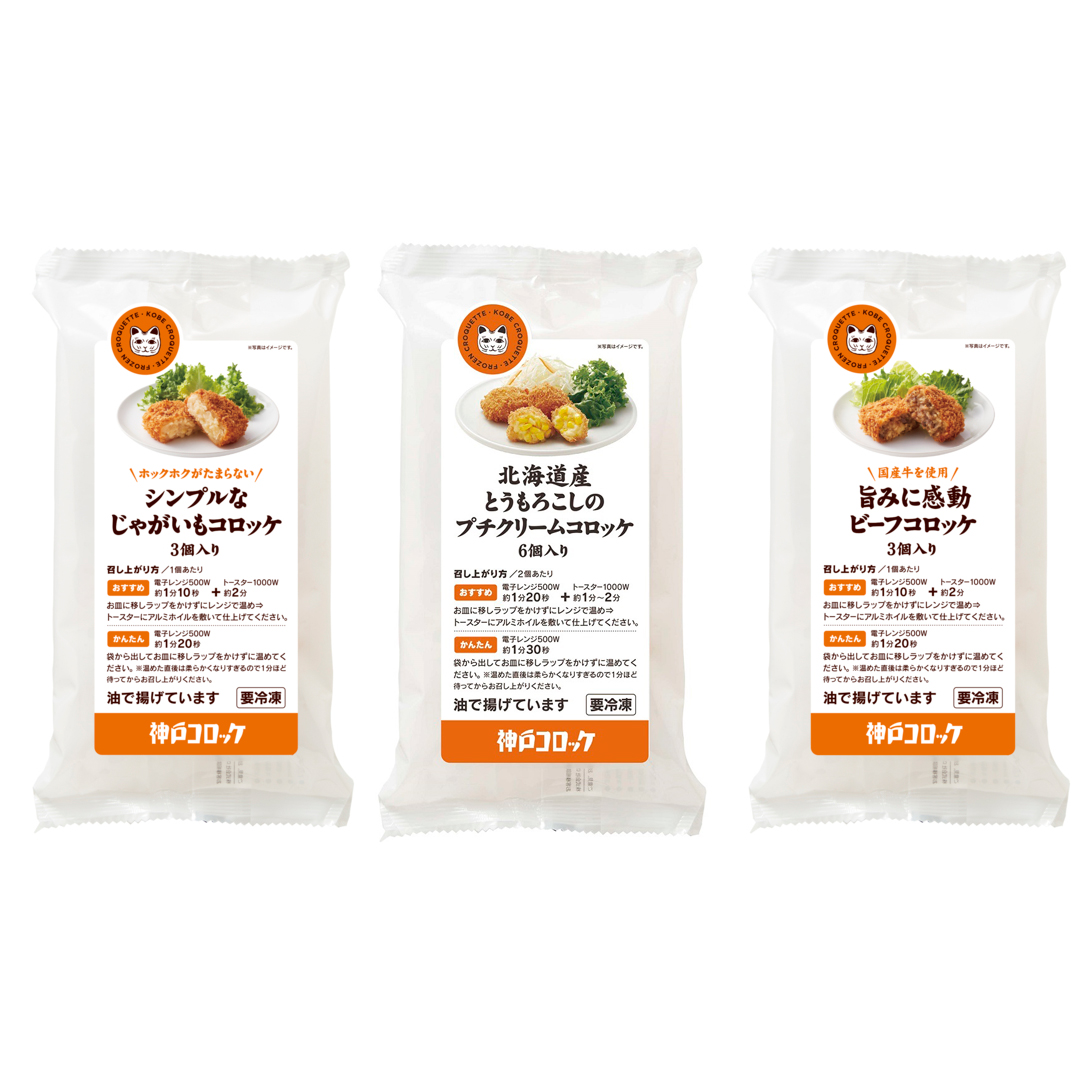 牛肉の旨みがあふれるビーフコロッケ、とうもろこしの自然な甘みを味わうコロッケ、じゃがいものホクホクのおいしさを堪能するじゃがいもコロッケの3種セット。