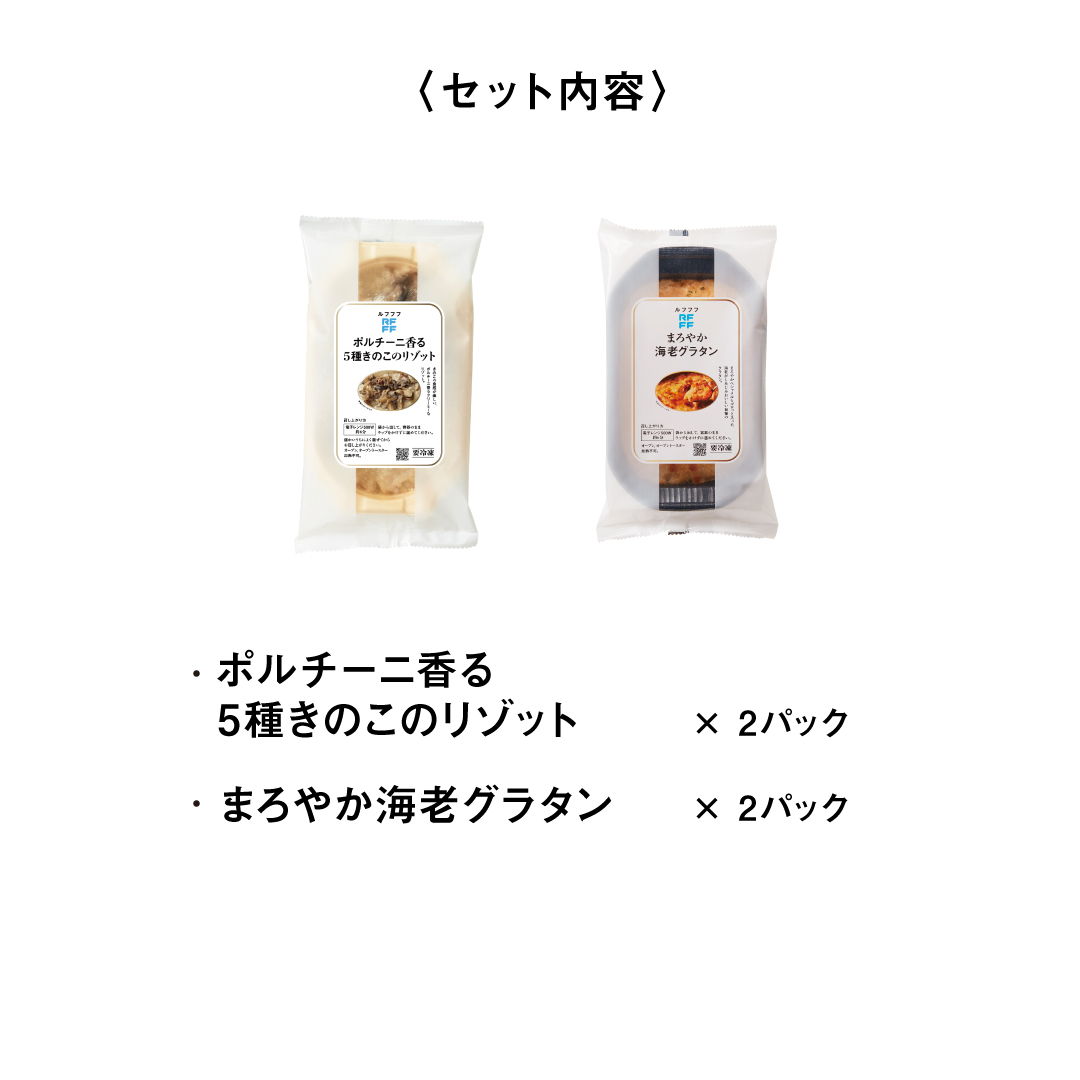 セット内容 | まろやか海老グラタン×2P / ポルチーニ香る 5種きのこのリゾット×2P |