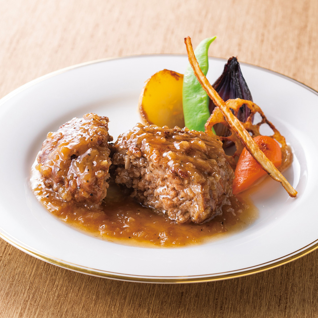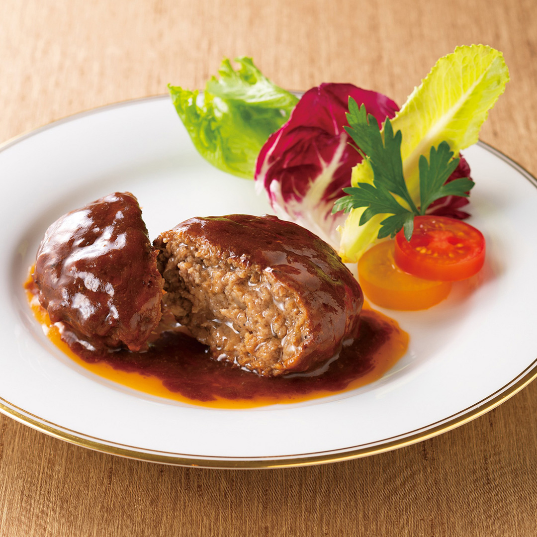 厳選した黒毛和牛100%を使用し、肉本来の旨みを閉じ込めたジューシーなハンバーグ。