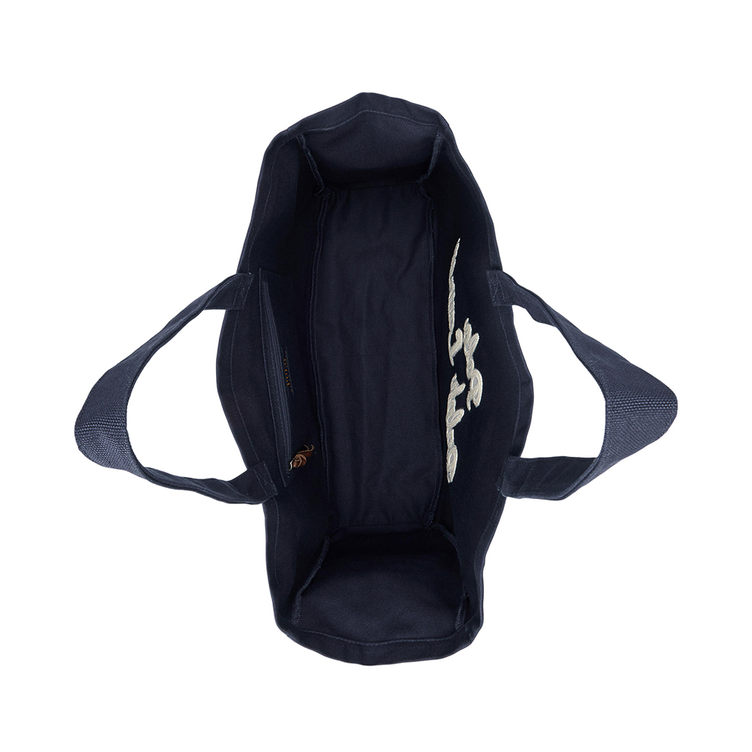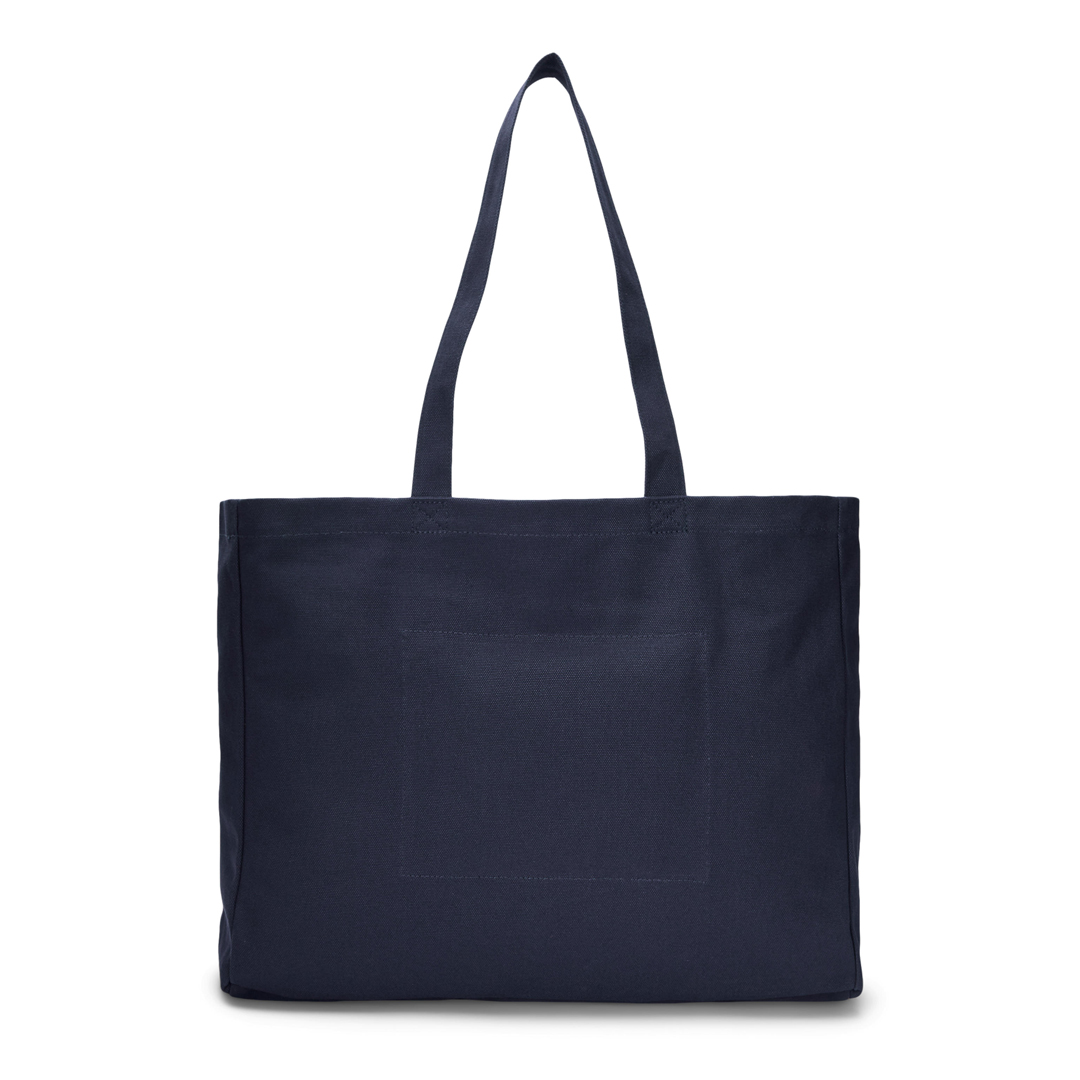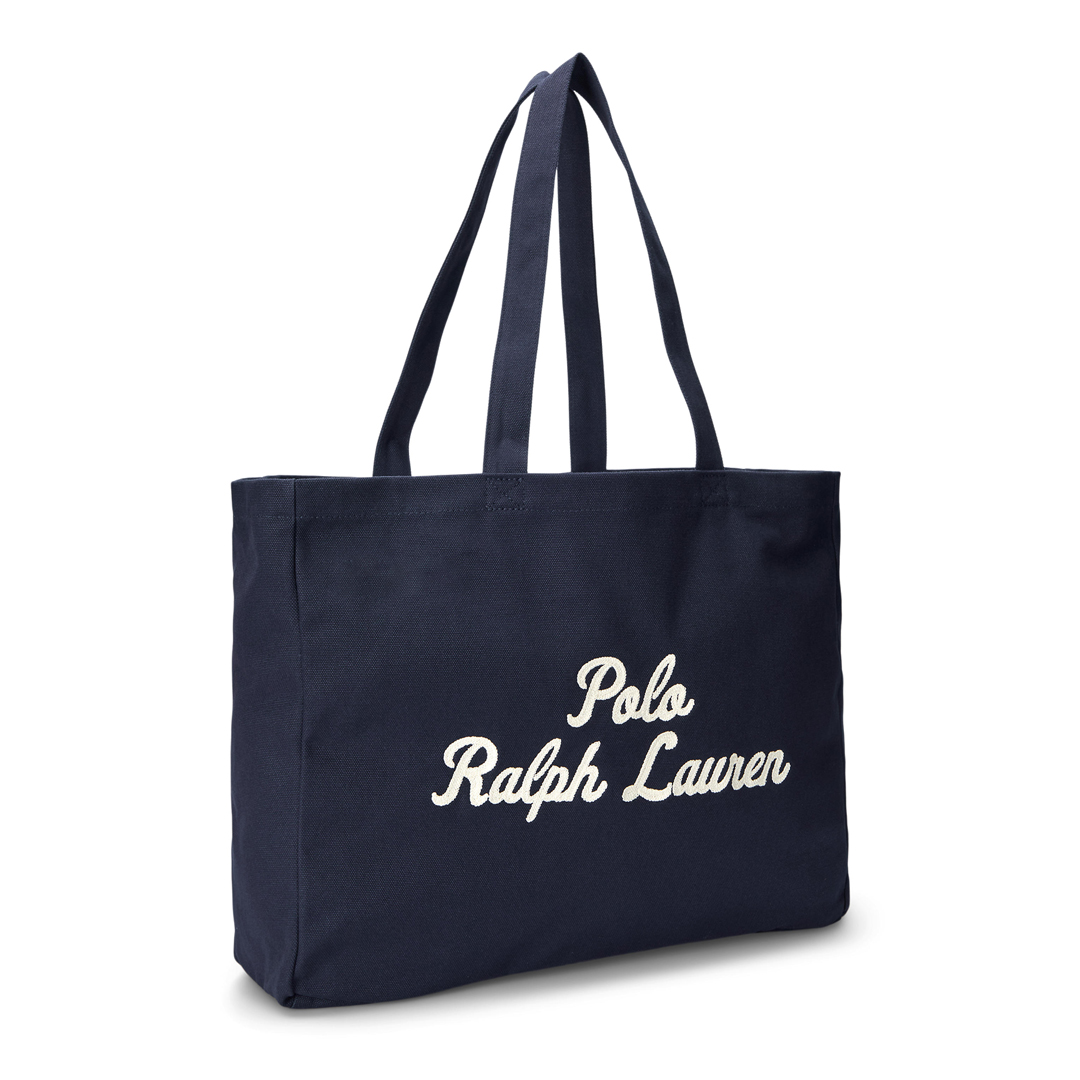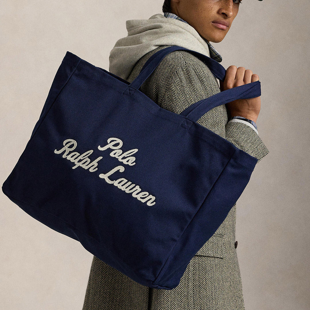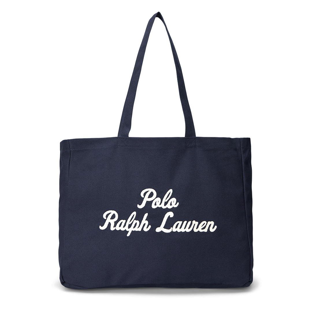 長持ちしやすいコットンキャンバスを使用し、Ralph Laurenのシグネチャーであるチェーンステッチのスクリプト刺繍が特徴的な、収納力に優れたトート。