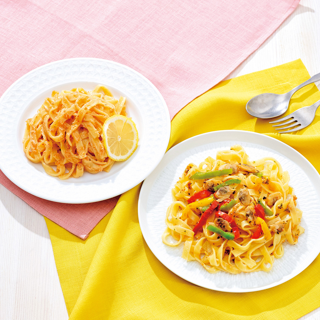 【パスタ】アサリの旨みと明太子の旨みに、食欲そそるガーリックをきかせた、ピリッと辛いめんたいアヒージョ風パスタと、クリーミーながらあっさりとした、明太子の旨みと辛みが引き立つ明太クリームパスタをセットにしました。