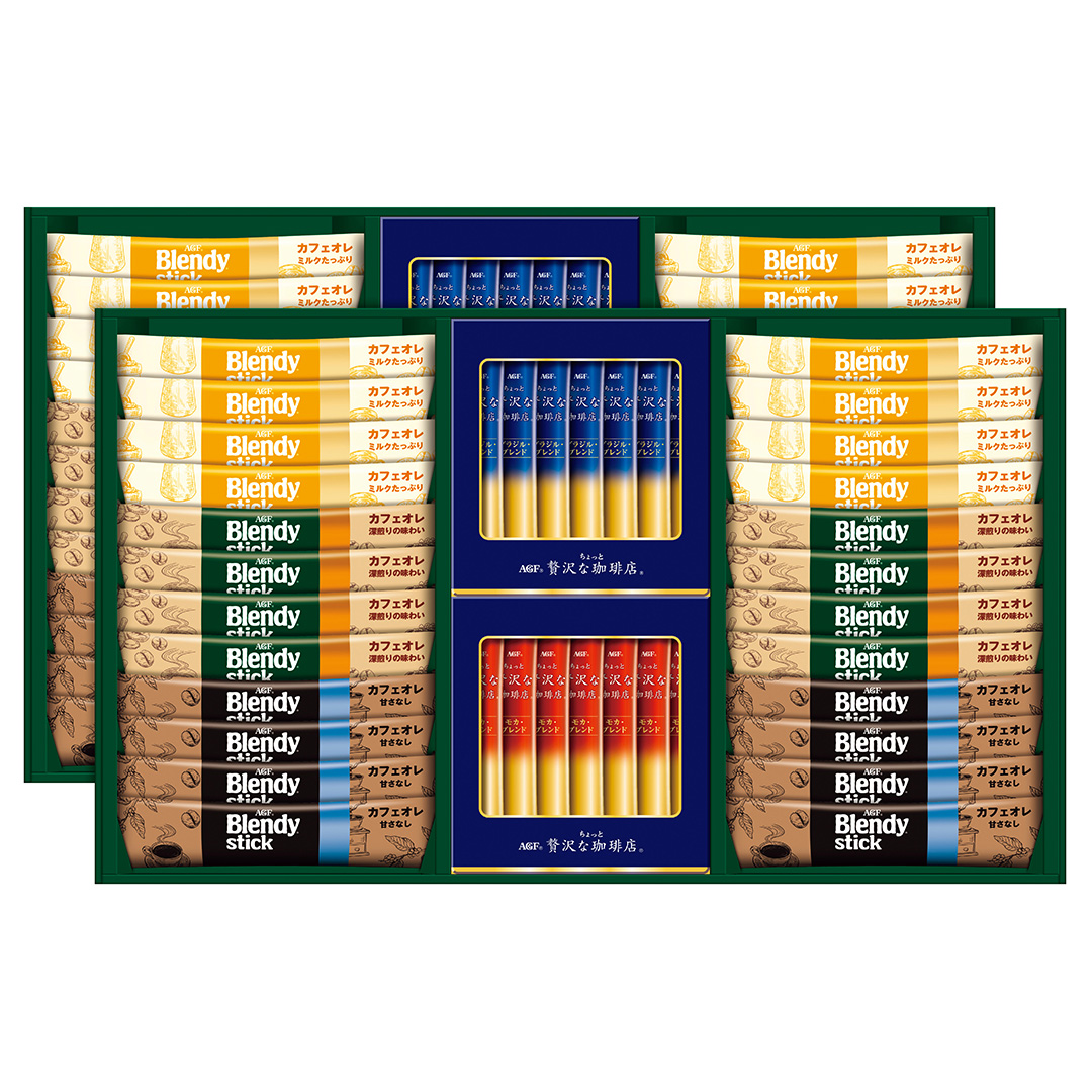 | セット内容 | ●ブレンディスティック カフェオレ14g×16本、カフェオレミルクたっぷり14g×16本、カフェオレ甘さなし11.4g×16本、ちょっと贅沢な珈琲店スティックブラック ブラジルブレンド2g×14本、モカブレンド2g×14本 |