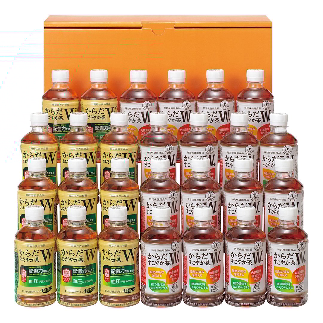 機能性表示食品の「からだおだやか茶W」と特定保健用食品の「からだすこやか茶W+」が入った毎日の健康を意識する方におすすめのギフトです。