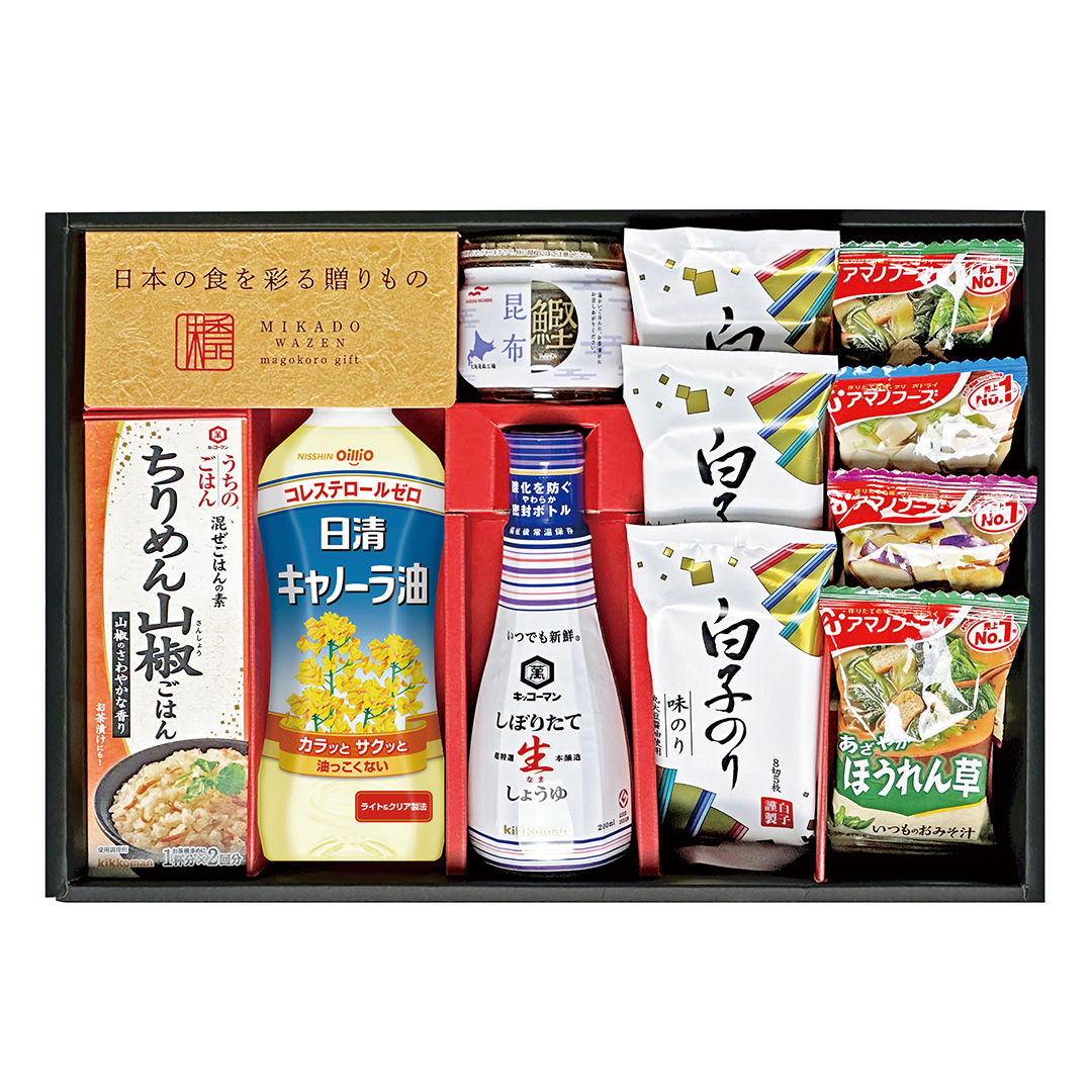 | セット内容 | ●キッコーマンしぼりたて生しょうゆ200ml、キッコーマン混ぜごはんの素ちりめん山椒(27g×2)、アマノフーズフリーズドライいつものおみそ汁(ほうれん草×2、なす・とうふ×各1)、日清キャノーラ油350g、白子のり(8切5枚)×3、マルハニチロ鰹昆布45g |