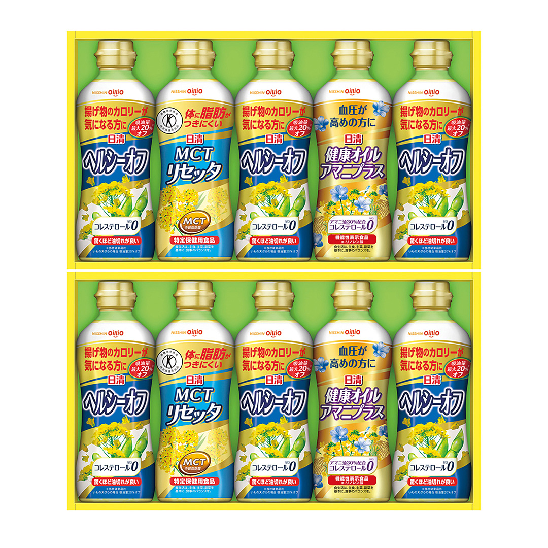 | セット内容 | ●日清MCTリセッタ350g×2、日清健康オイルアマニプラス350g×2(機能性表示食品:届出番号A82、届出表示:本品は、α-リノレン酸を含んでおり、血圧が高めの方に適した機能を持つ食用油です。)、日清ヘルシーオフ350g×6 |