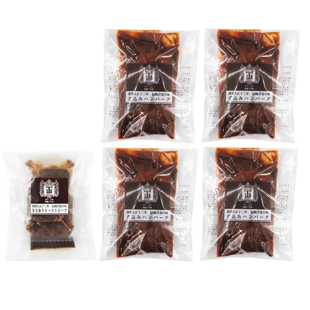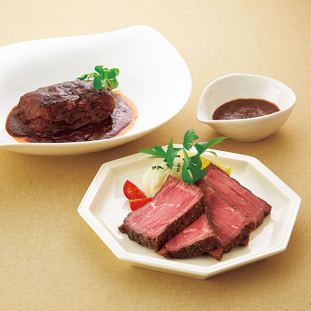 | 内容量 | 黒毛和牛ローストビーフ(もも) 100g、デミグラスソース 30g、煮込みハンバーグ 180g(固形量110g)×4 |
