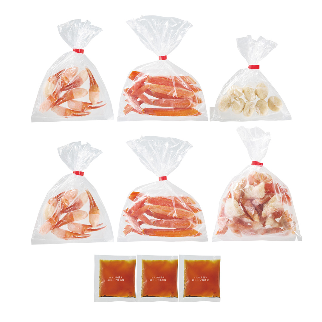 | 内容量 | 紅ずわいがに肩カット 300g、紅ずわいがに脚・紅ずわいがに剥き爪 各8個×2、かにつみれ 8個、タレ 50g×3 |