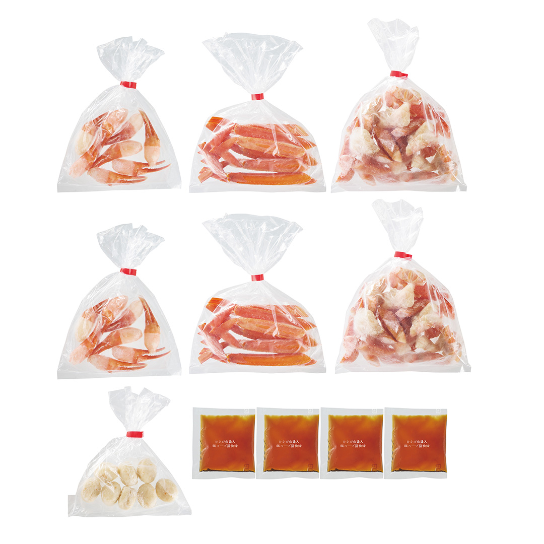 | 内容量 | 紅ずわいがに肩カット 300g×2、紅ずわいがに脚・紅ずわいがに剥き爪 各8個×2、かにつみれ 8個、タレ 50g×4 |