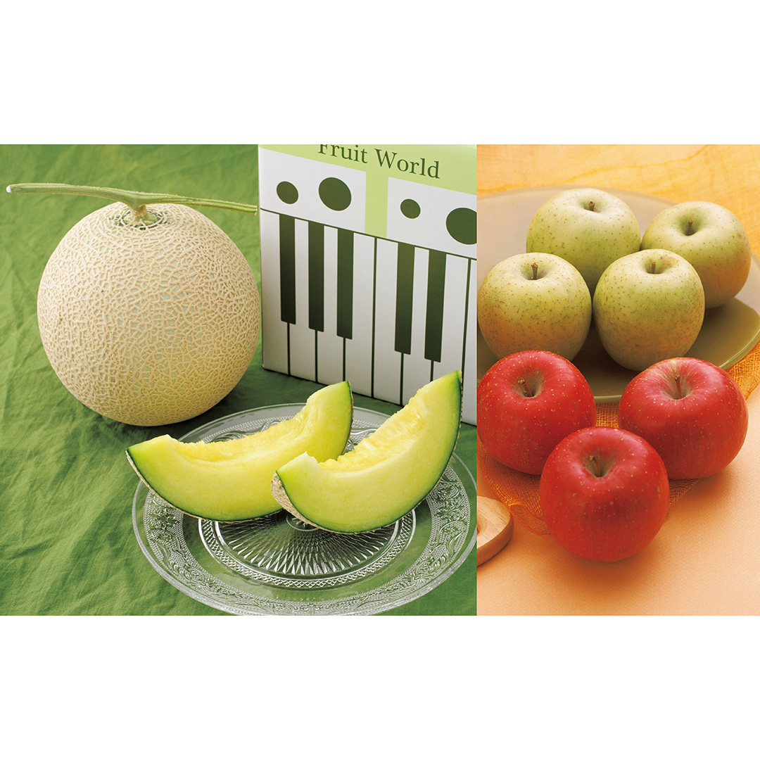 とろけるような果肉の「クラウンメロン」と甘みの強い「王林」、甘みと酸味のバランスが絶妙な「サンふじ」をセットにしました。