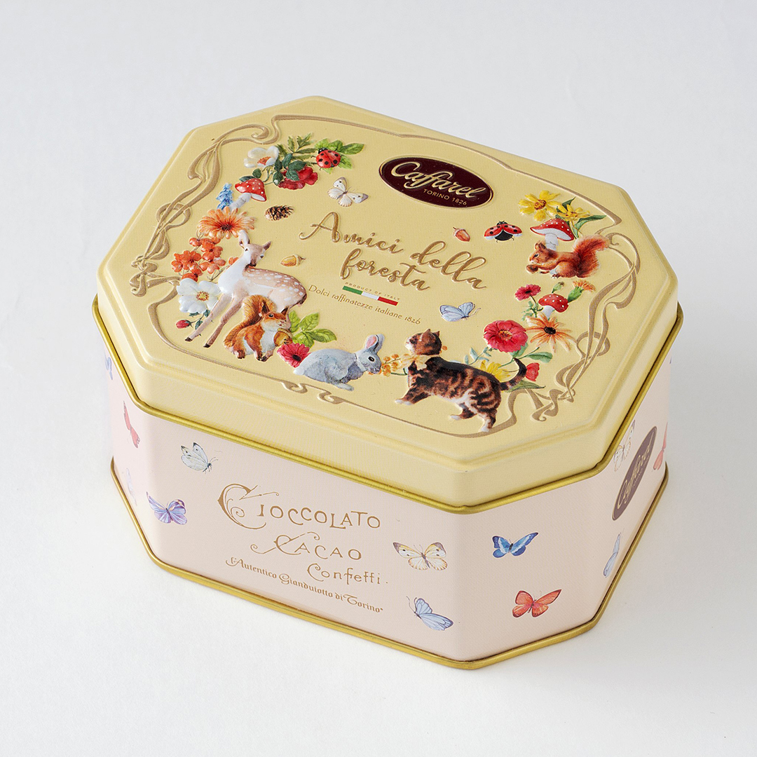 缶には森に迷い込んだネコが動物達に出会うシーンが描かれています。