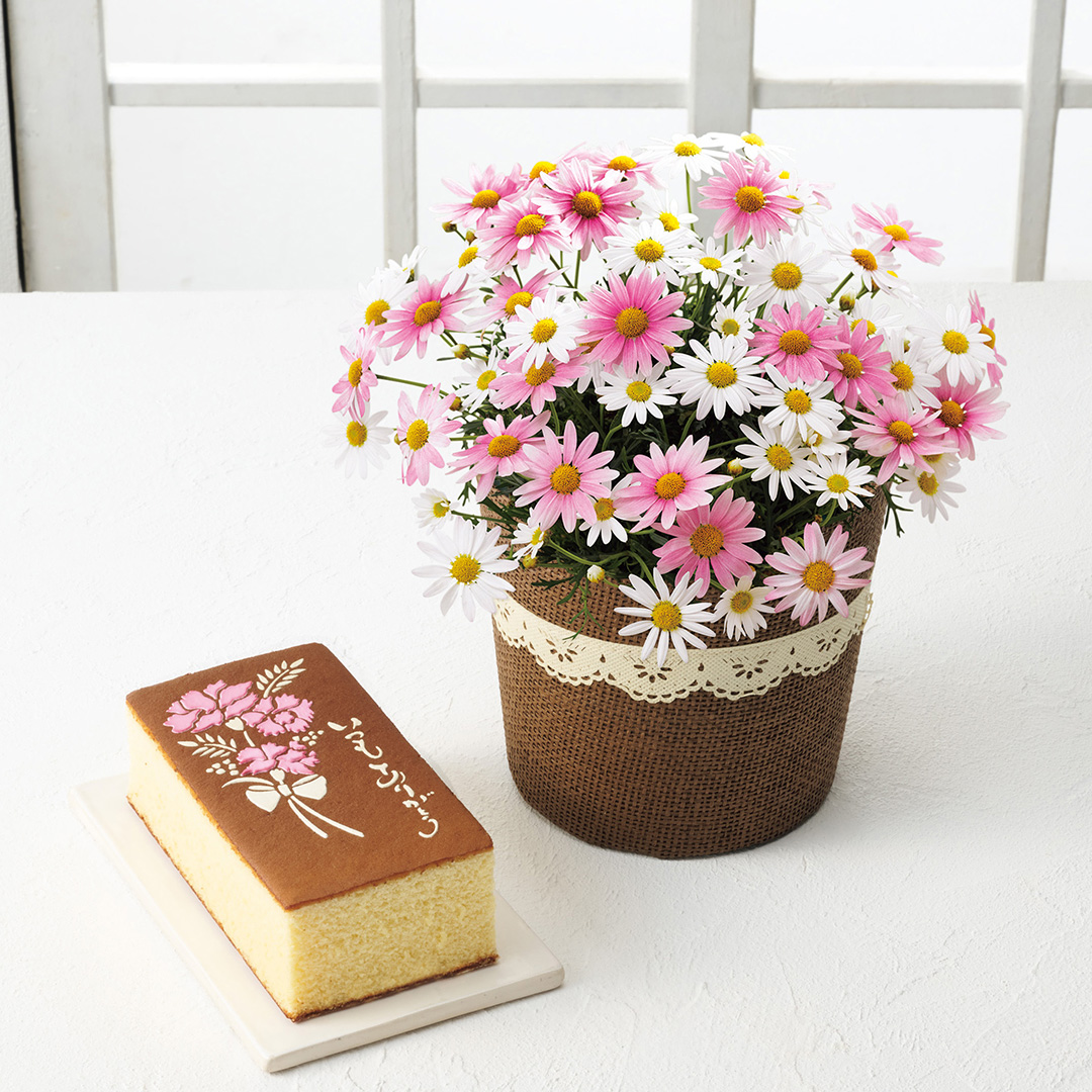 マーガレット鉢植え「さくらべーる」とお母さんへの感謝の気持ちを刷り込んだ長﨑堂の母の日カステーラのセットです。