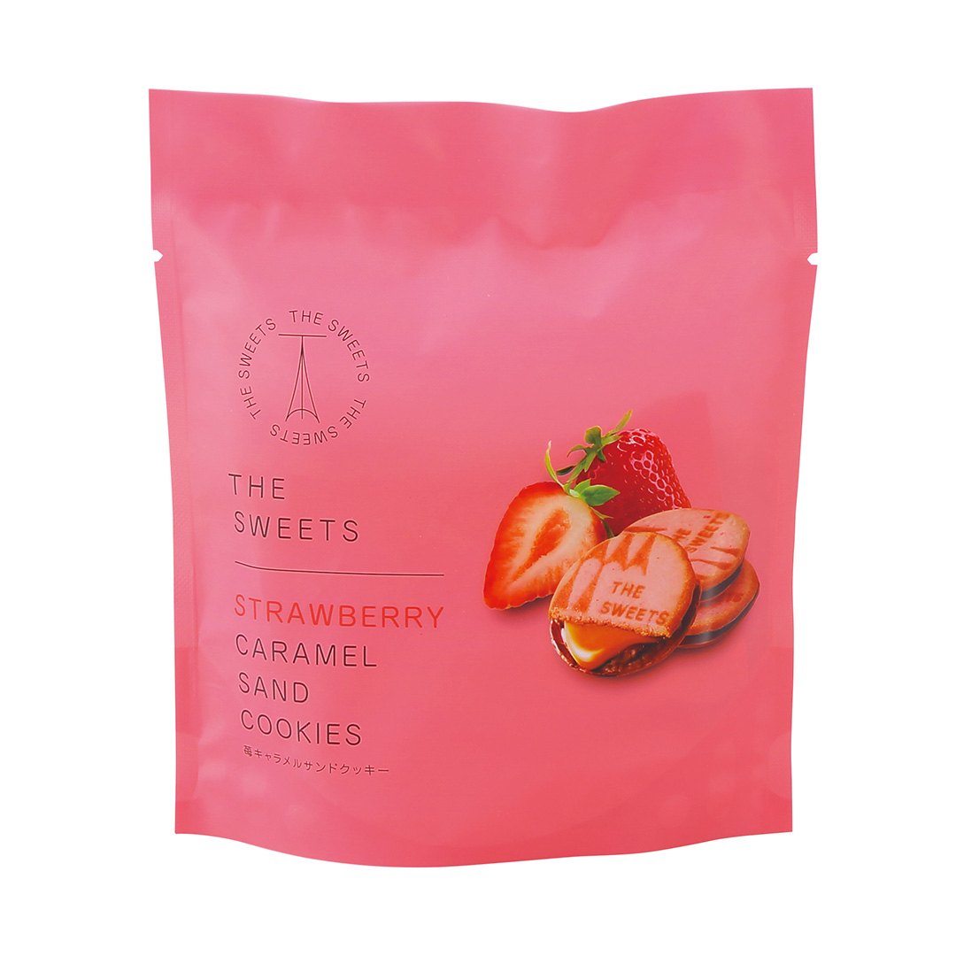 苺キャラメルサンドはあまおう苺のフリーズドライを混ぜた濃厚なラングドシャ生地でキャラメルとチョコレートをサンドしました。