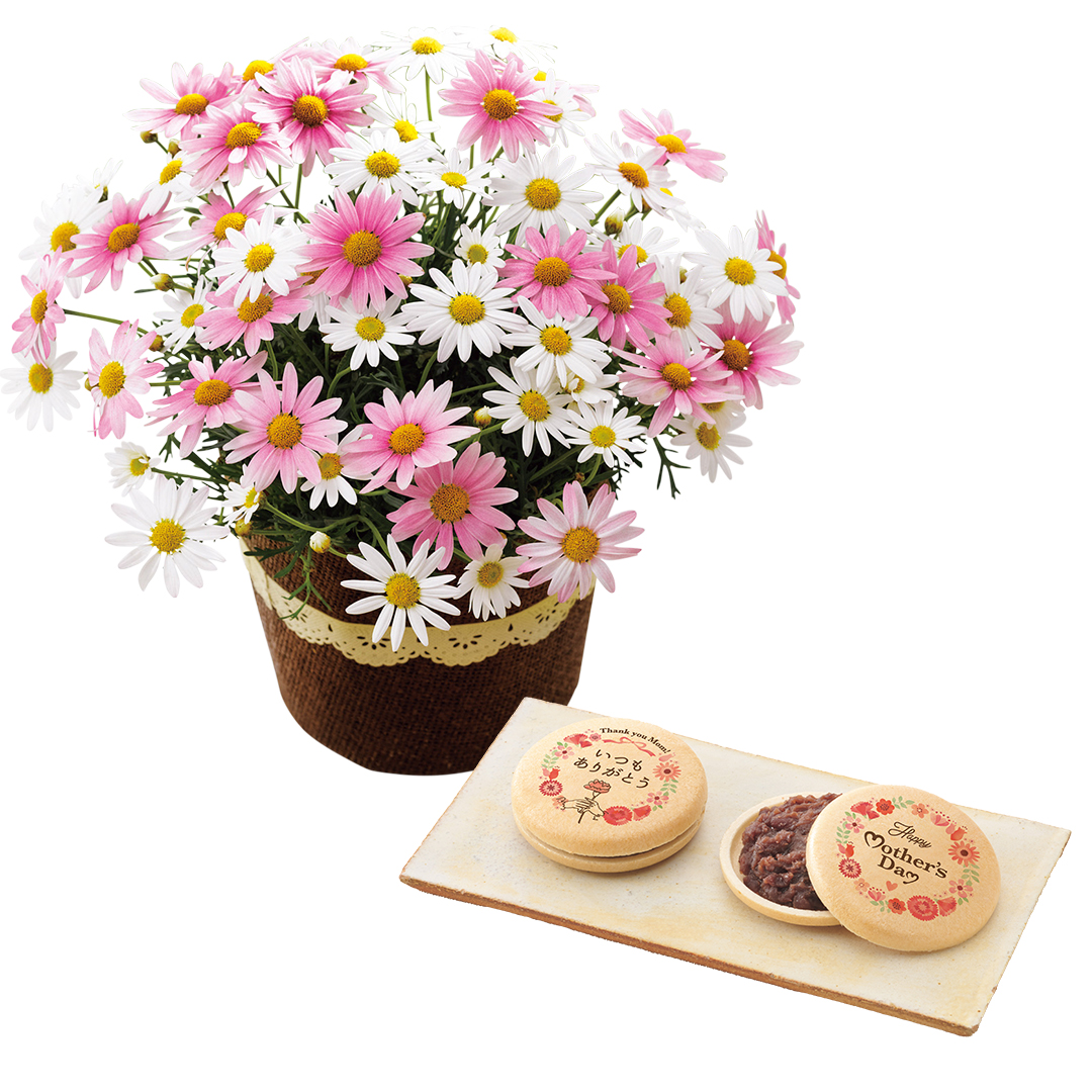 愛らしいマーガレット鉢植えと、母の日オリジナルデザインを施した香ばしい最中。