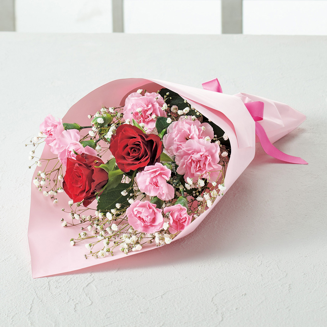バラ、カーネーション、かすみ草を組み合わせた、お母さんが喜ぶ美しい花束です。