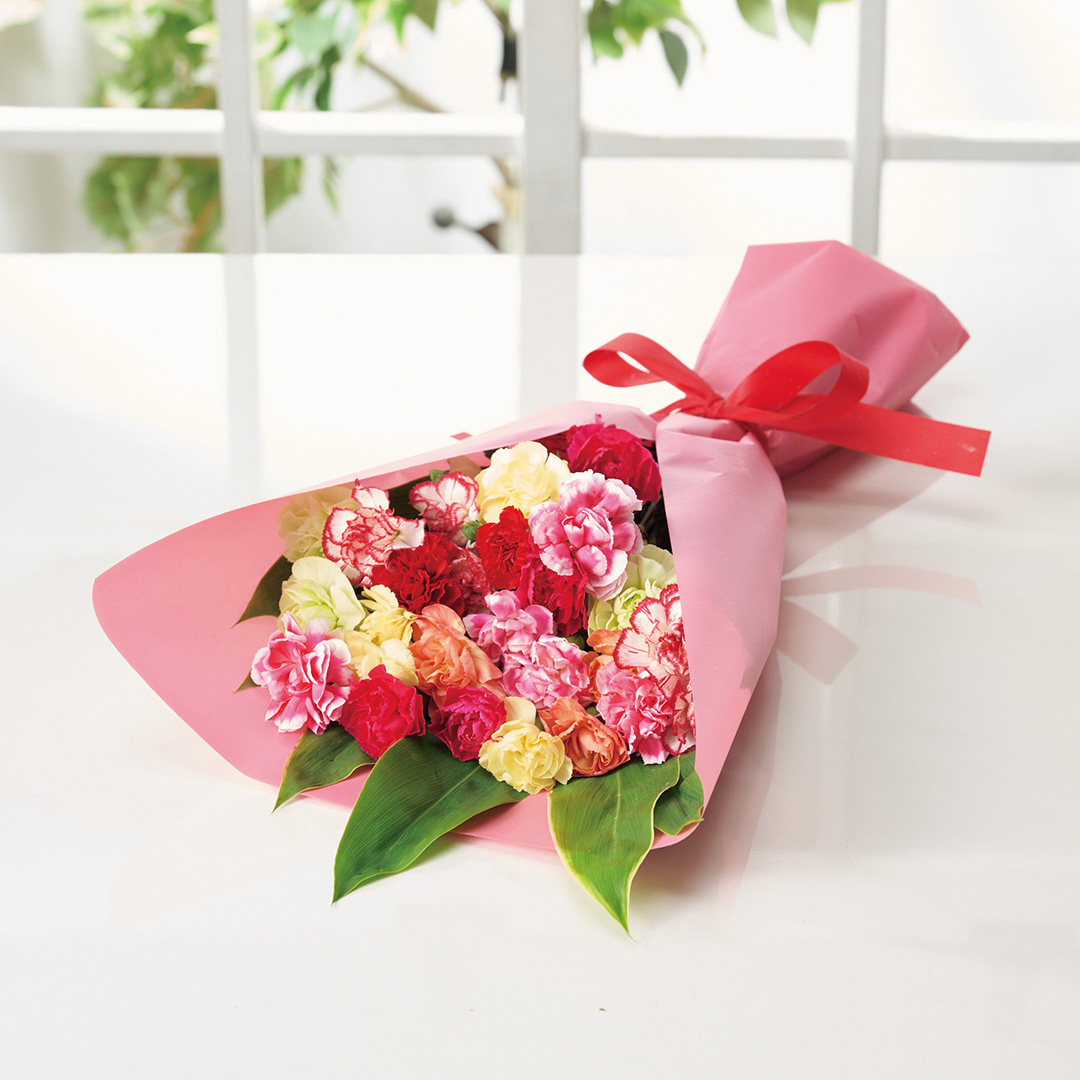 お母さんを笑顔にする、カラフルな7色のスプレー咲きカーネーションのブーケです。