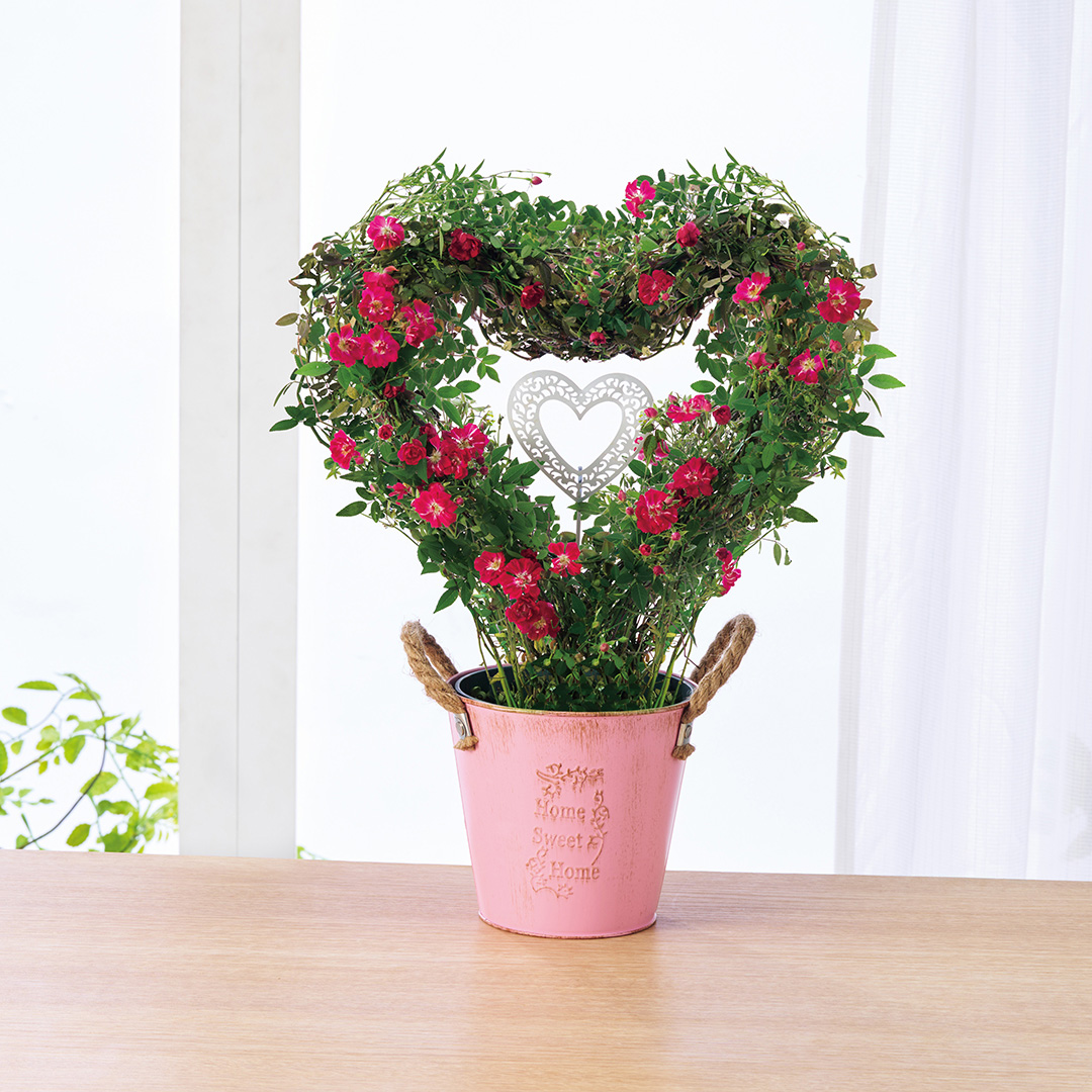 お母さんへの愛情を形にした、可愛らしいハート型のリングに仕立てたつるバラです。