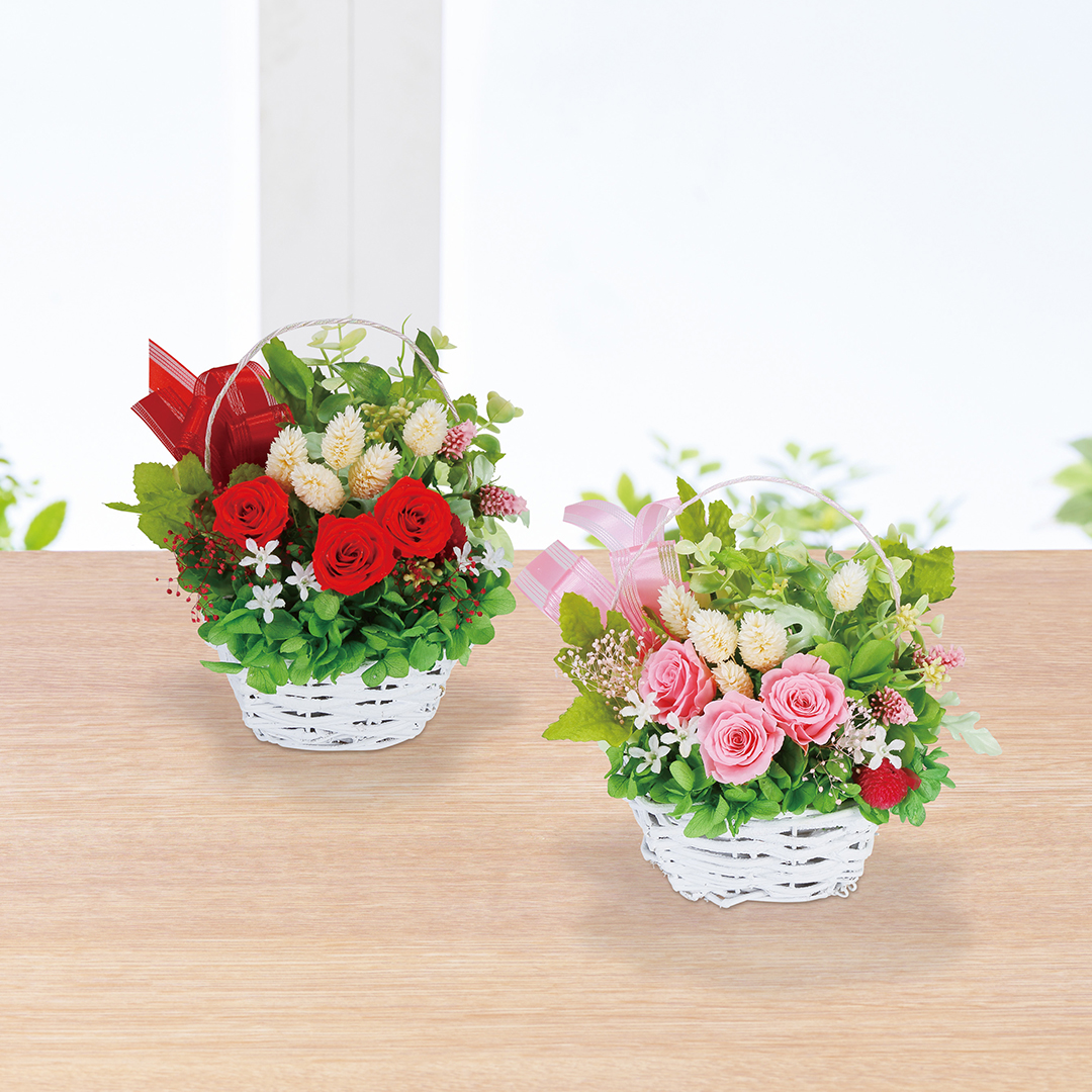 みずみずしさが長持ちする赤いプリザの籠
