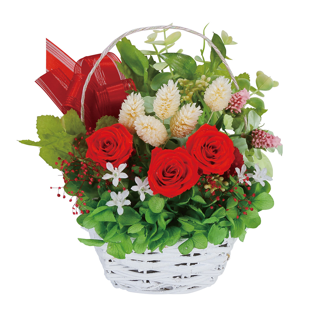 生花のような美しい姿を長期間楽しめる、赤いプリザーブドフラワーの華やかな籠アレンジ。