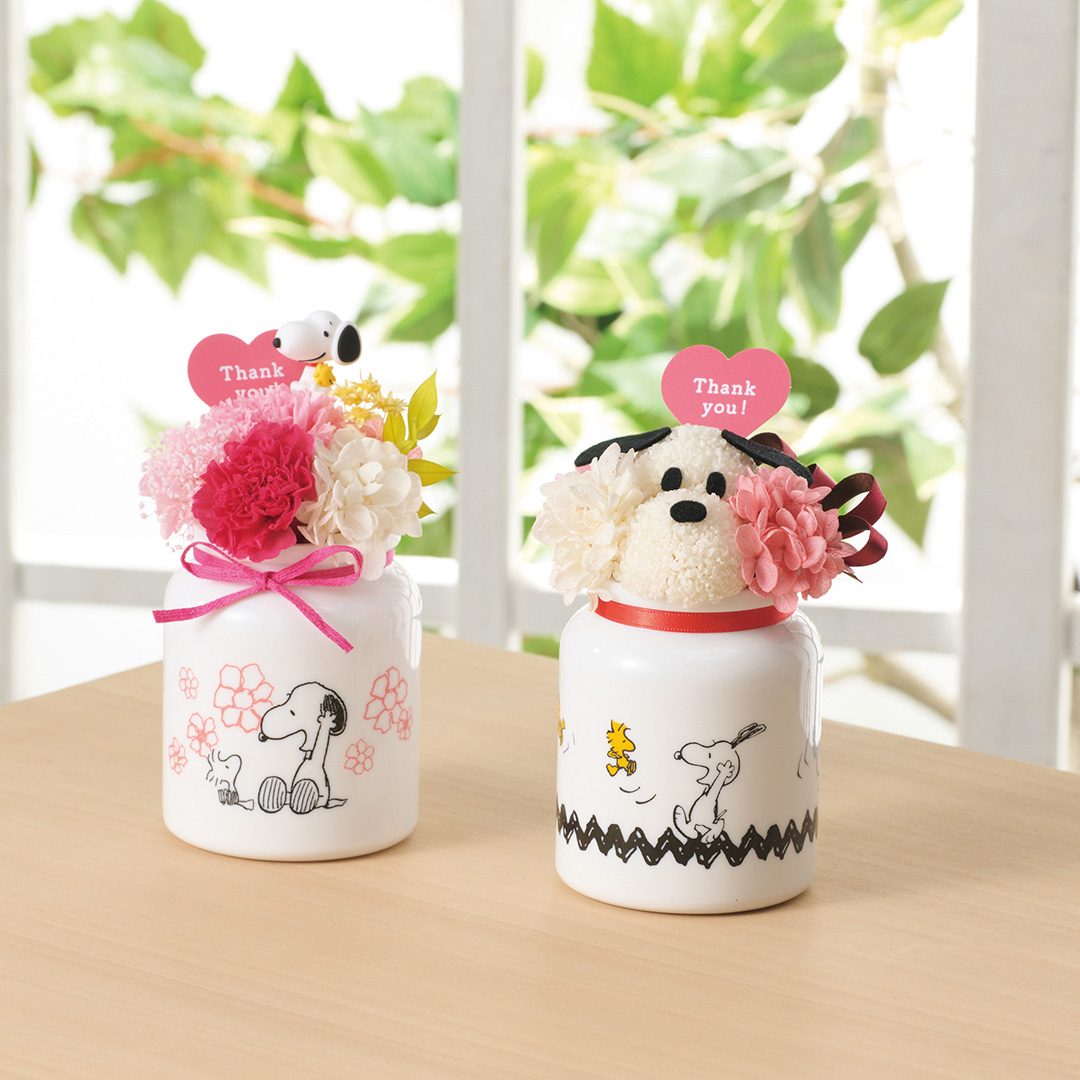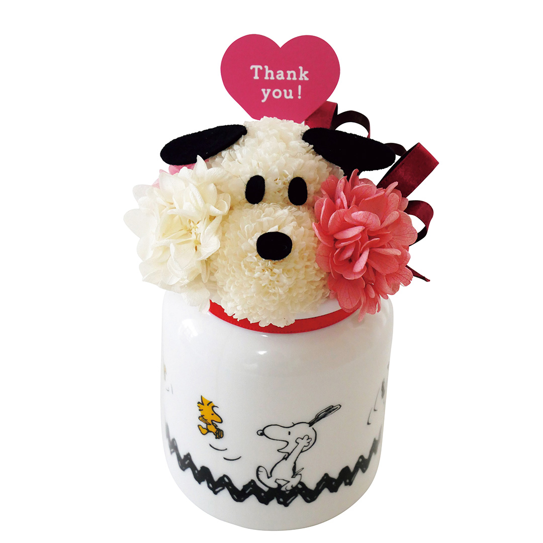 プリザーブドフラワーのスヌーピーが顔を出す、「Thank you」ピック付きの可愛いギフト。