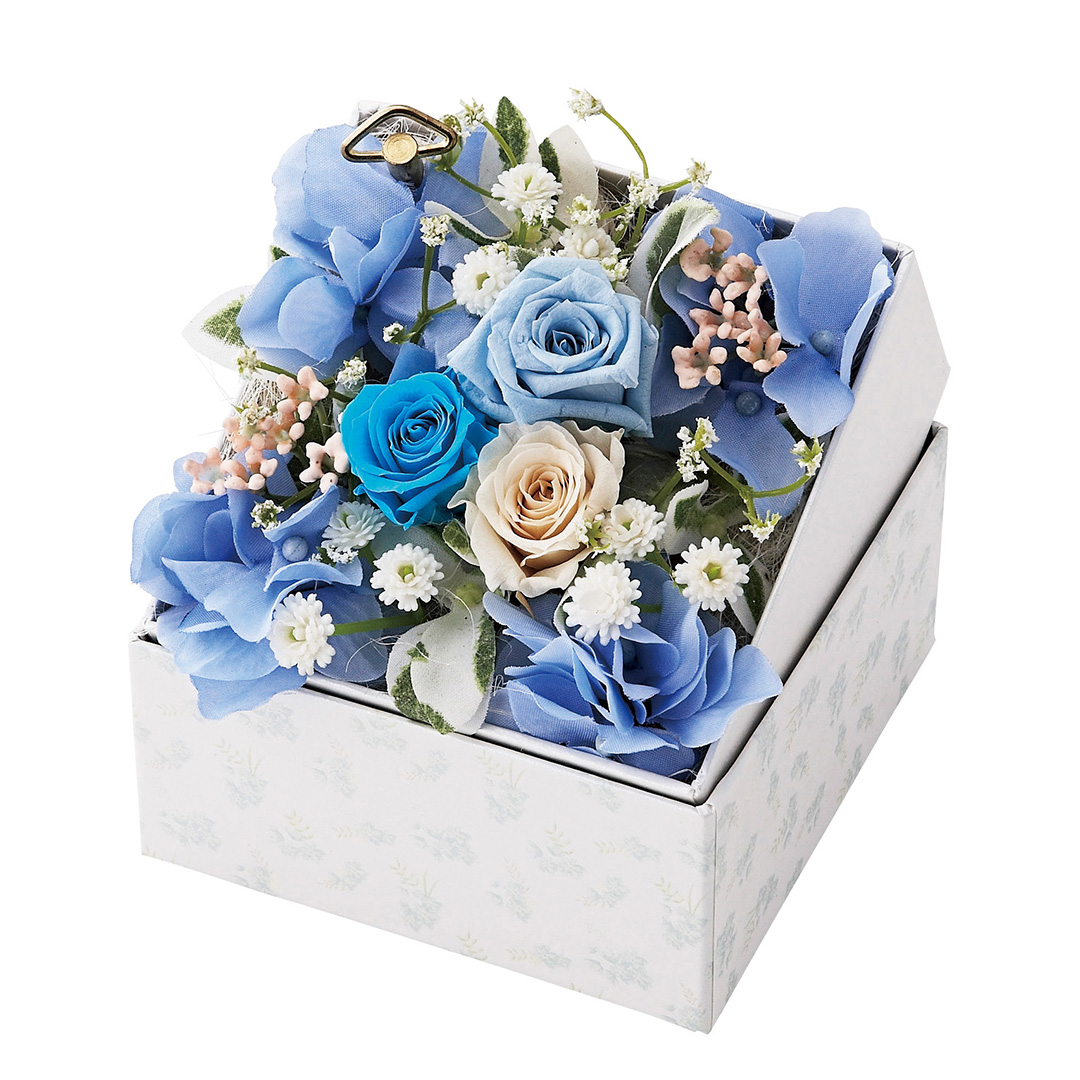 オリジナルボックスにアレンジしたオルゴール付きのプリザーブド&アーティフィシャルフラワーアレンジメント。
