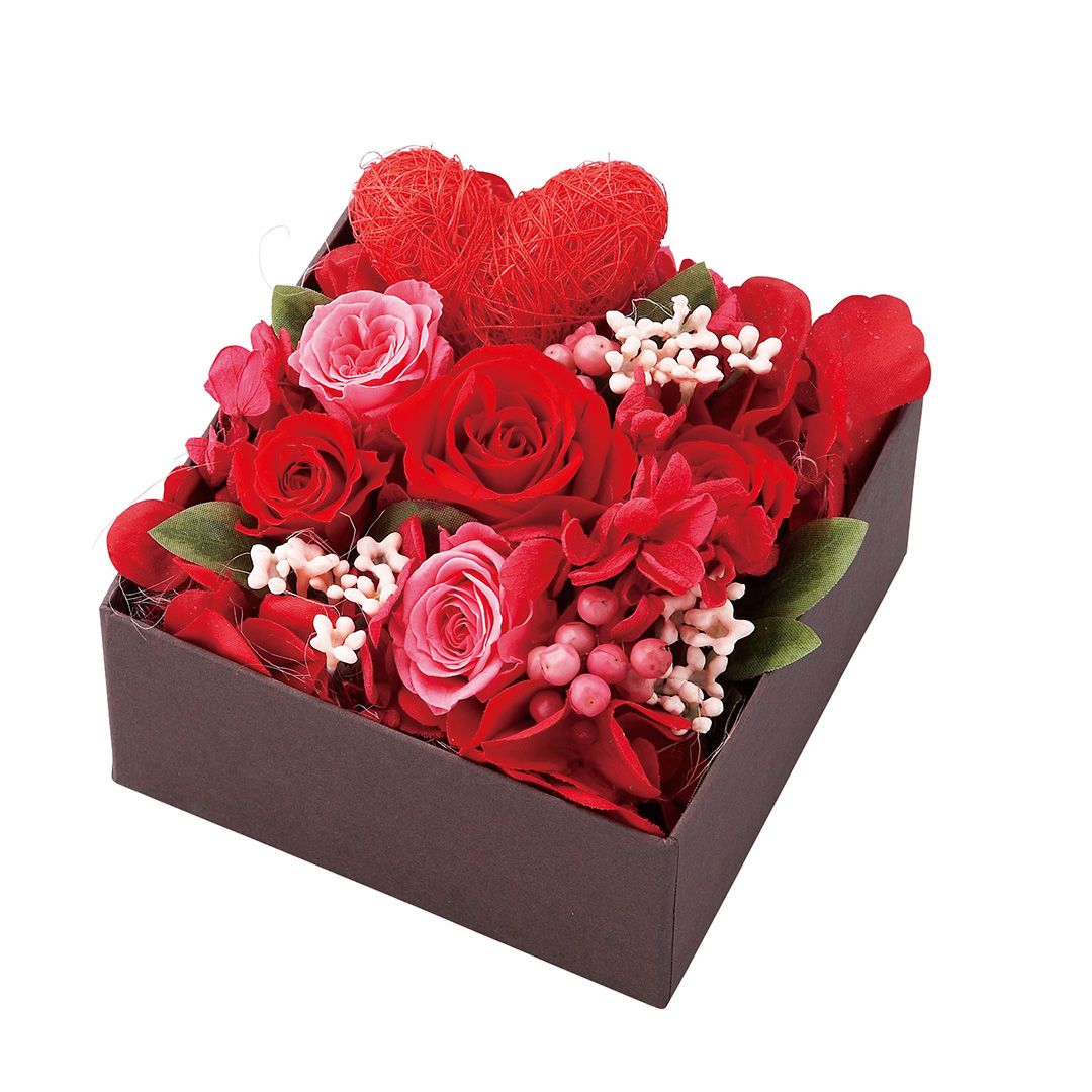 | 商品材料 | ●プリザーブドフラワー(バラ、アジサイ、ペッパーベリー)、アーティフィシャルフラワー(アジサイ、小花、グリーン)、オリジナルペーパーボックス、ファイバー、シサルハートピック |