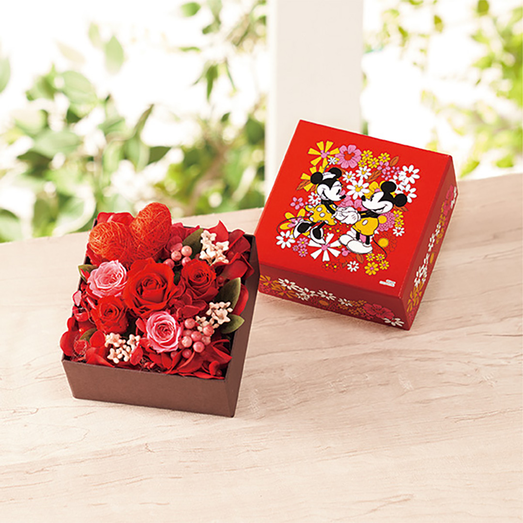 想いをぎゅっと詰めたハートのピックがポイント。大切な人へ贈るディズニーのボックスフラワー。